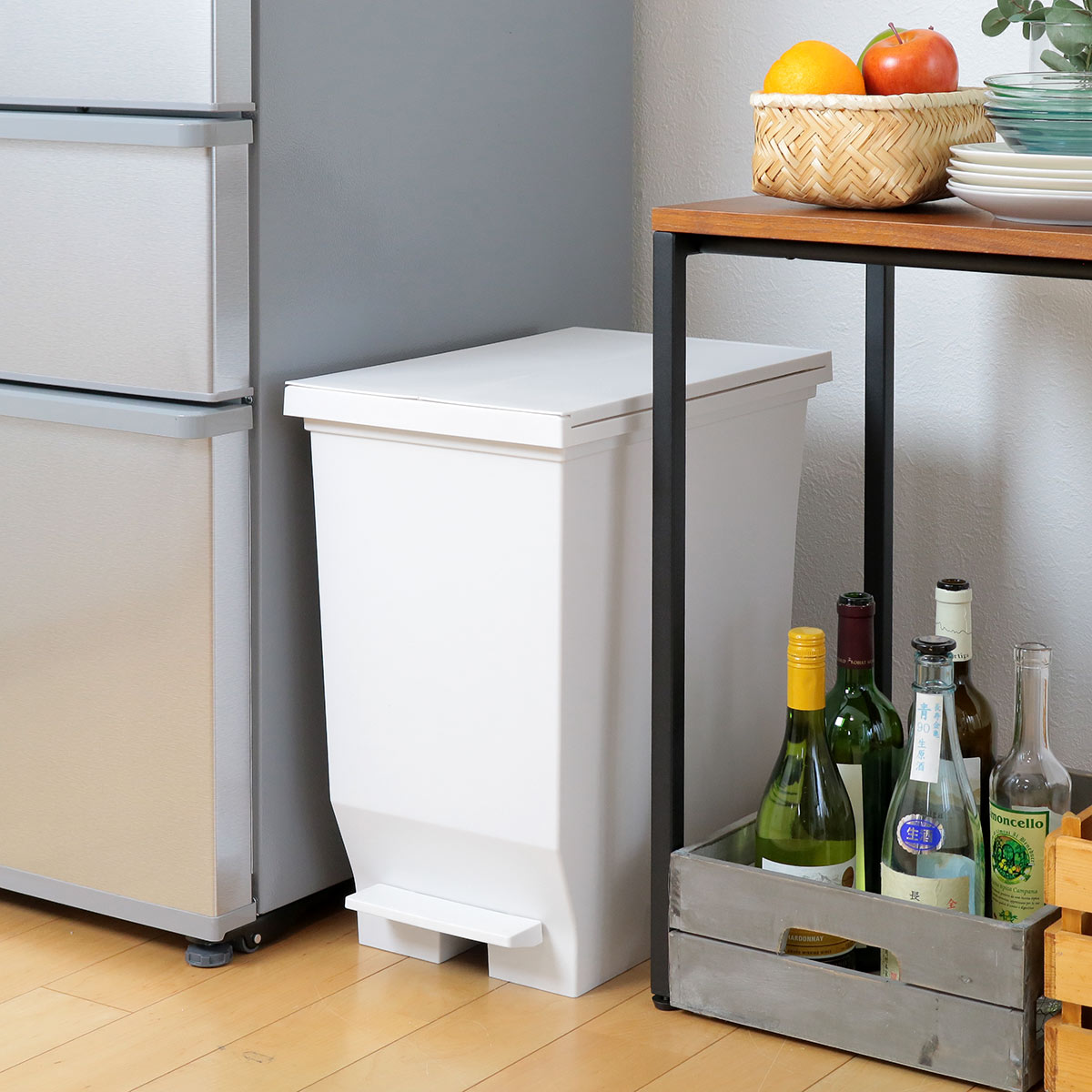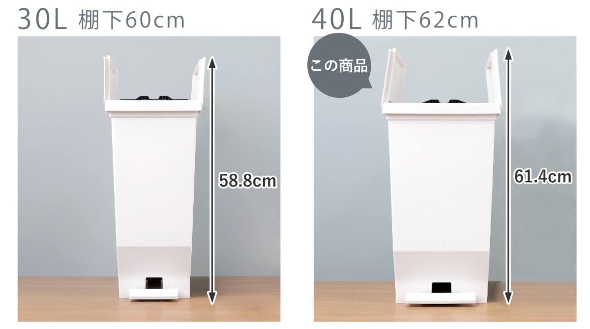 ふたを閉じたとき、30Lと40Lで高さが揃うデザイン。ゴミの量や置きたい場所に合わせてレイアウトできます。いくつか並べても棚下にすっきり収まるから、じゃまにならず日々の暮らしも快適です。