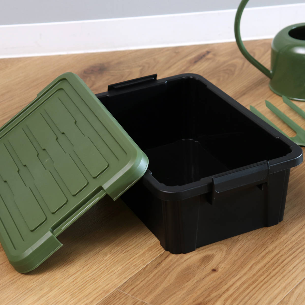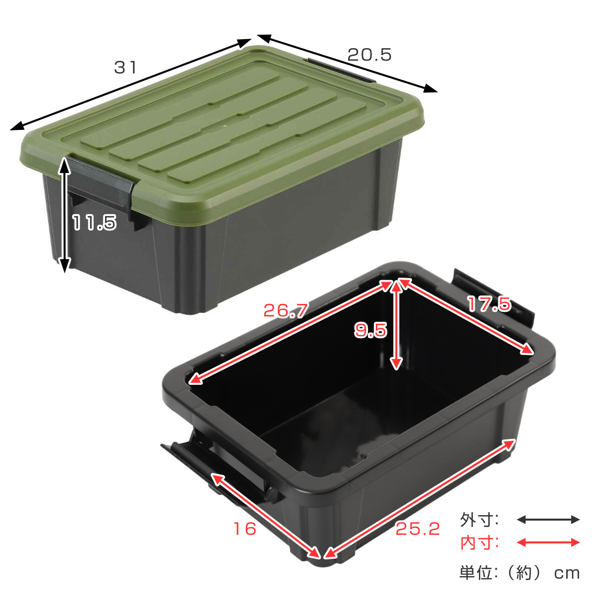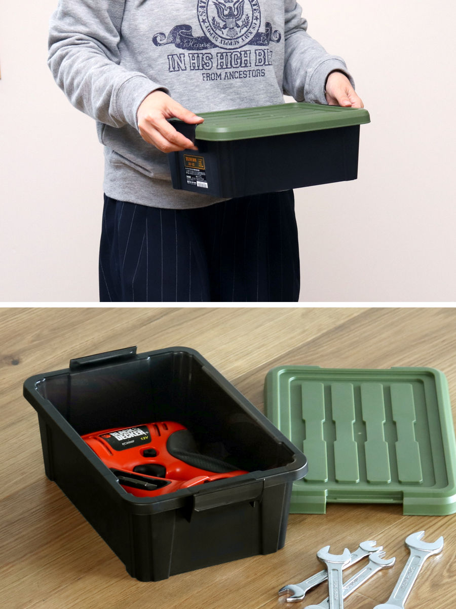 持ち運びに便利なコンテナケースは、キャンプなど屋外のアクティビティや、ガレージで使用する道具入れにするのもオススメです。フタが雨水や砂ぼこりの侵入を防ぎ、汚れてもサッと水洗いできます。