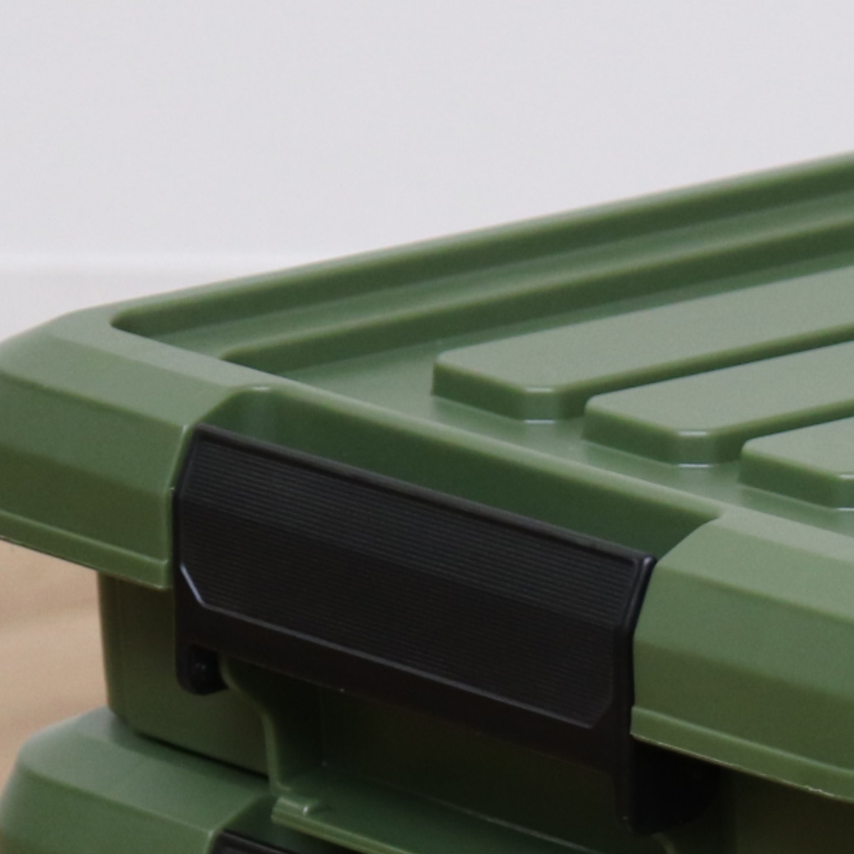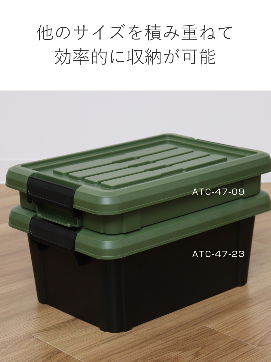同じサイズ同士はもちろん、同シリーズの「ATC-47-23」の上にフタを付けても、外しても積み重ねることができます。フタを外して積み重ねる場合は、バックルで上のタフコンをしっかりと固定が可能です。効率的に積み重ねられるので車のトランクなどスペースが限られている場所にも無駄なく積み込めます。