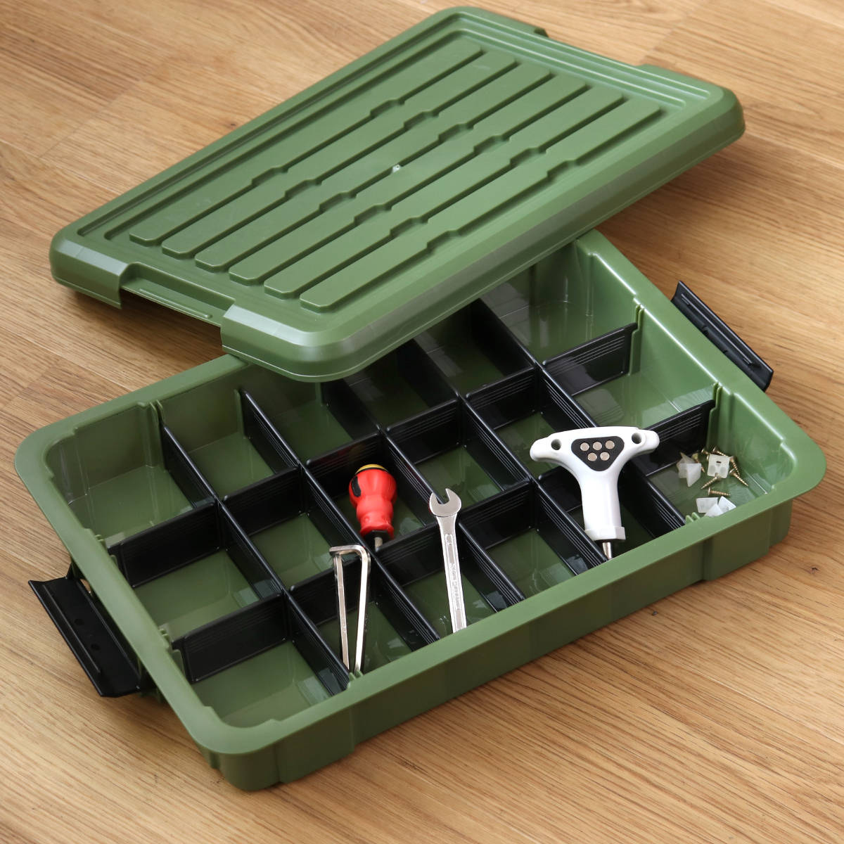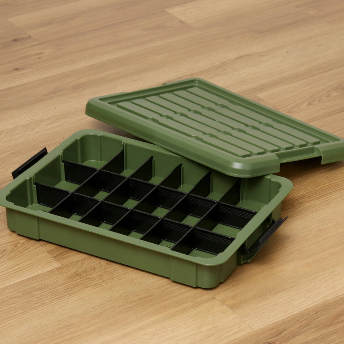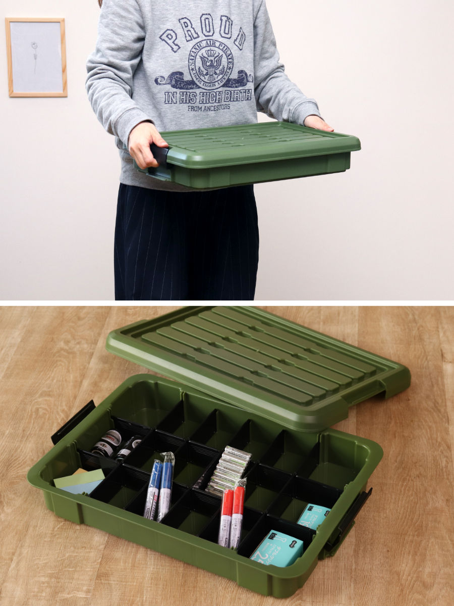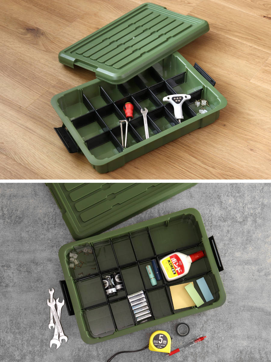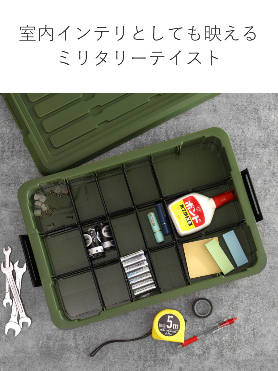 工具や日用品を収納しておくのに便利な収納ボックスです。細かい小物も仕切りで整理整頓でき、フタを閉めることで生活感を隠すことができます。ミリタリーテイストなデザインでリビングやキッチンなど見えるところに置いてもスタイリッシュさを保てます。