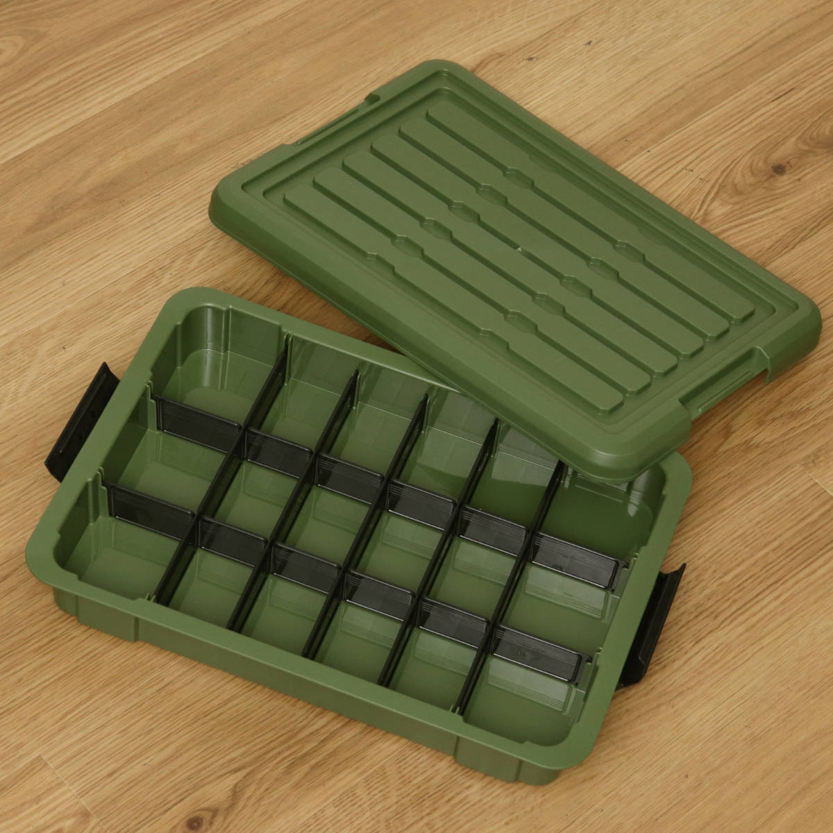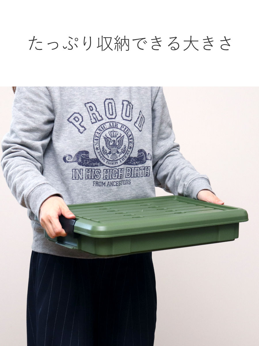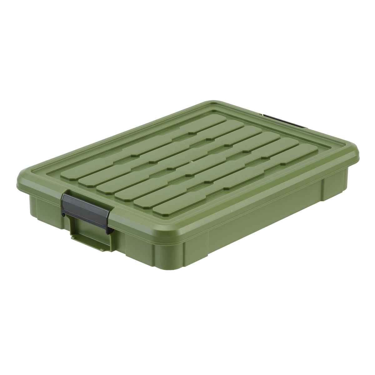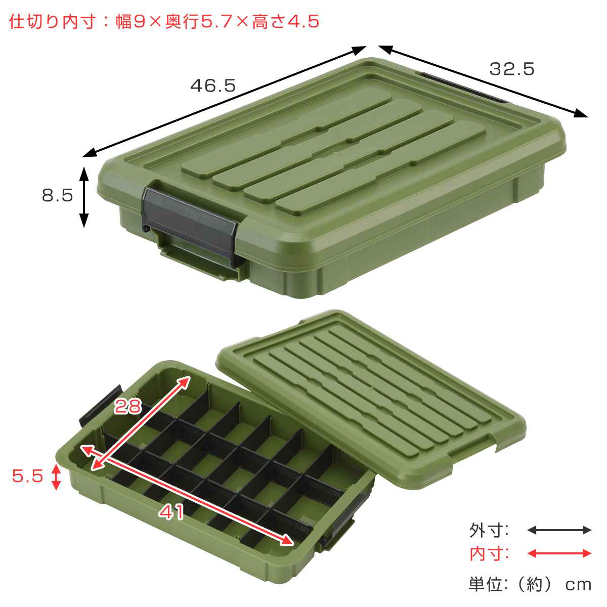 工具や日用品を収納しておくのに便利な収納ボックスです。細かい小物も仕切りで整理整頓でき、フタを閉めることで生活感を隠すことができます。ミリタリーテイストなデザインでリビングやキッチンなど見えるところに置いてもスタイリッシュさを保てます。