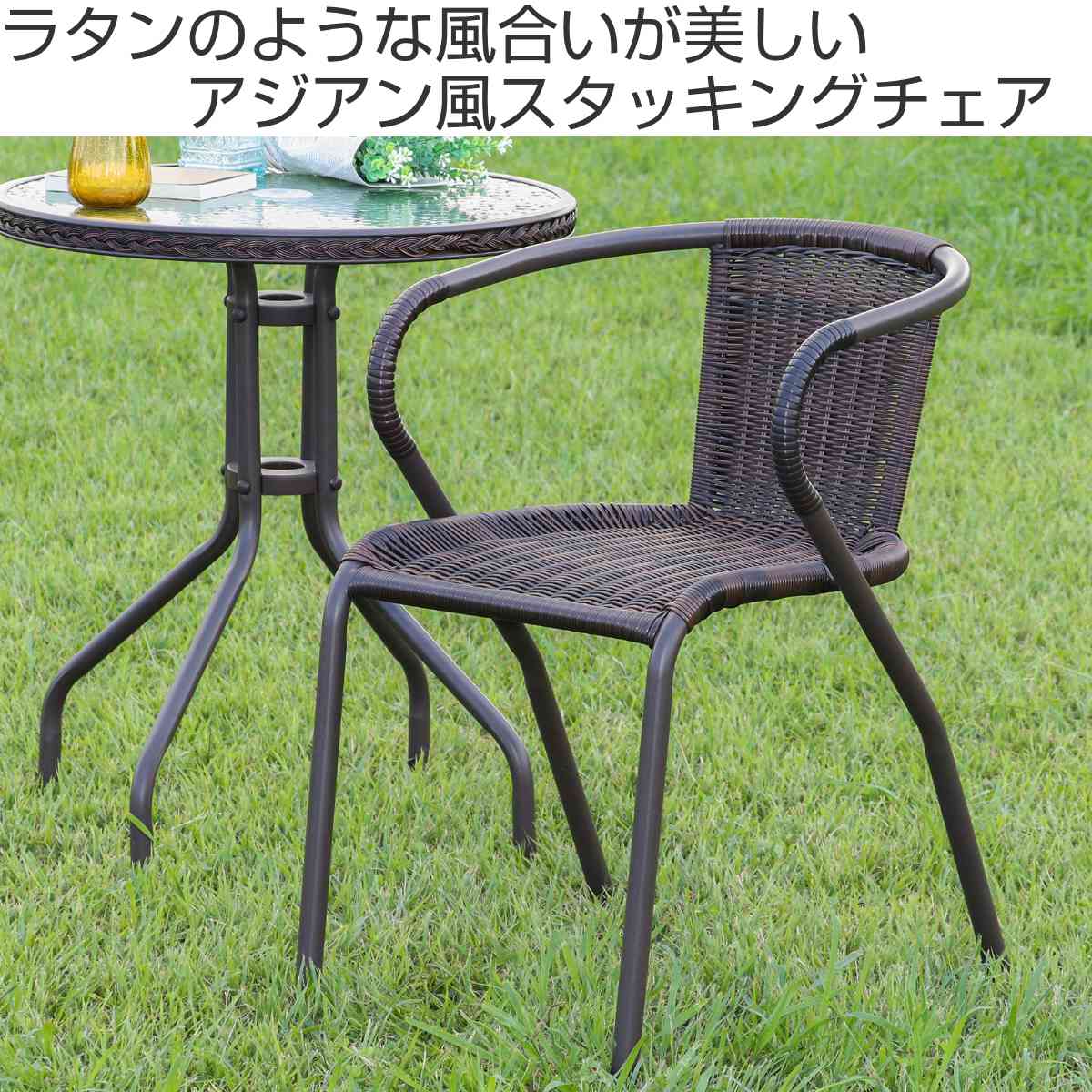 ラタンの風合いを表現した繊細な網目が美しい、アジアンモダンなデザインのガーデンチェアです。お庭でカフェ気分でゆったりとした時間を過ごすのにおすすめです。