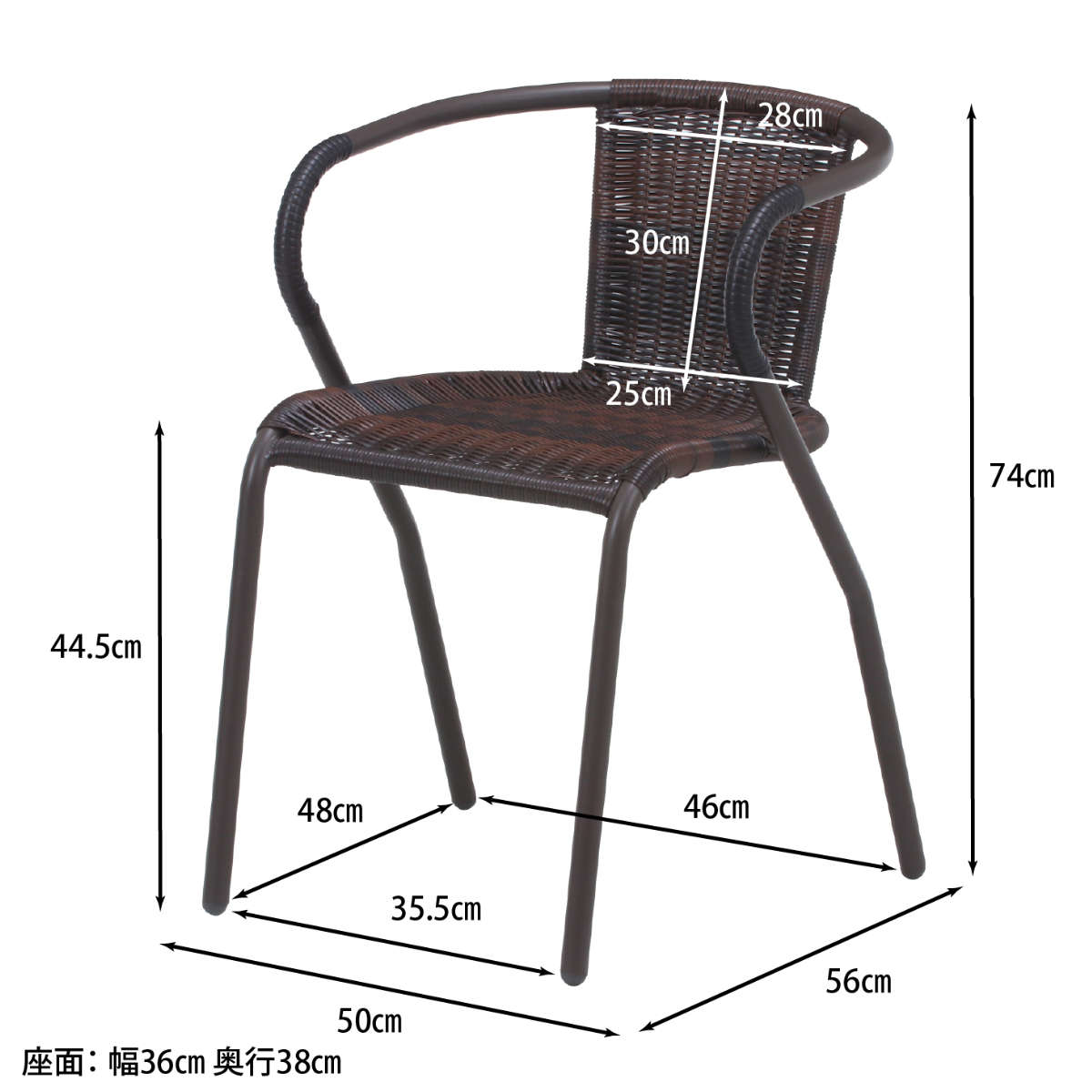 | サイズ | 約 幅50×奥行56×高さ74(cm) 座面高:約 45(cm) 座面サイズ:約 幅36×奥行38(cm) |