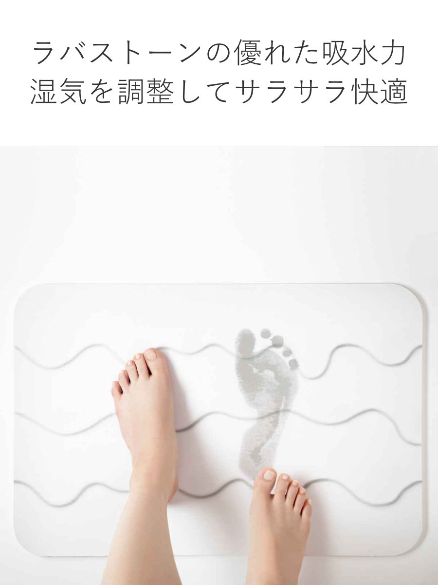 吸水性の高い自然素材、ラバストーン(溶岩石)から作られたバスマットです。マットに水が付いた瞬間から素早く水分を吸い取ります。調湿性に優れ、吸収した水分を放出するので、表面はいつもサラサラで衛生的です。