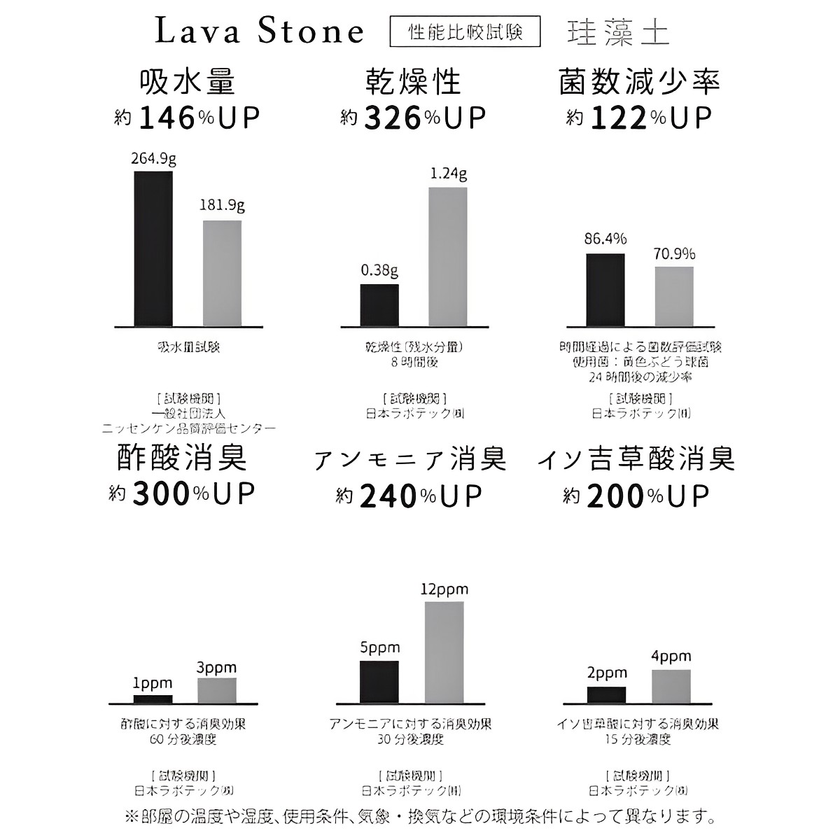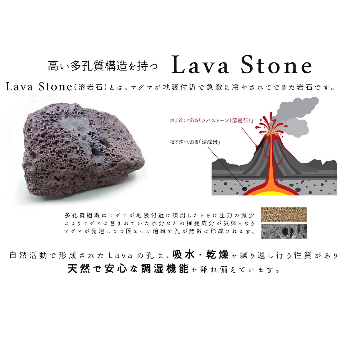 ラバストーンとはマグマが地表付近で急激に冷やされて出来た岩石です。自然活動で形成されたラバの孔は、吸水・乾燥を繰り返し行う性質があり、天然で安心な調湿機能を兼ね備えています。同様の効果のある「珪藻土」と比較して吸水量・乾燥性・消臭性・抗菌性全てにおいて優れているのが特徴です。