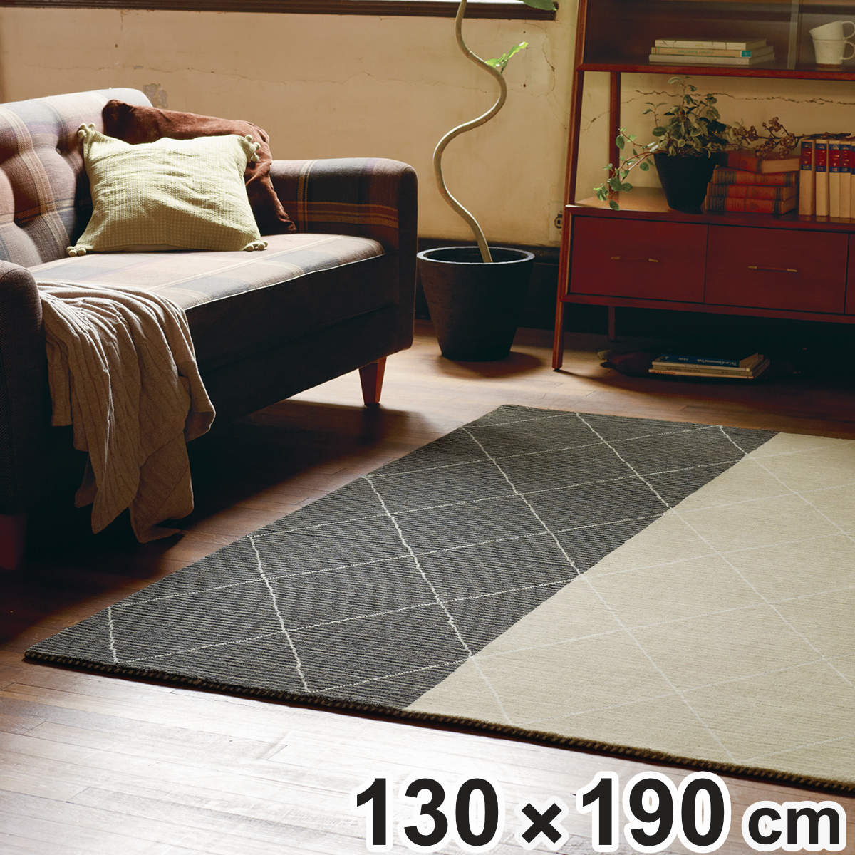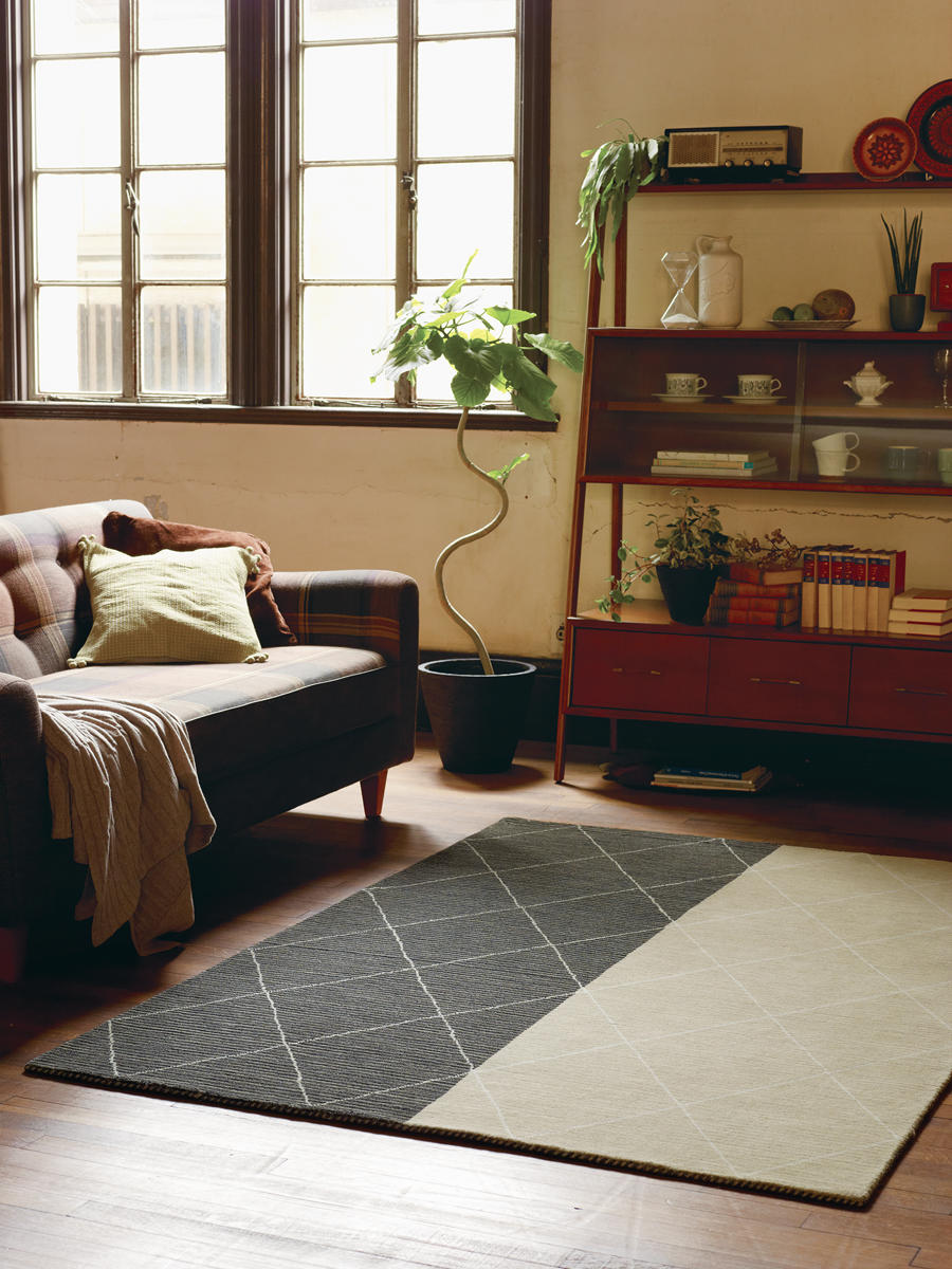 ウール100%ならではのやわらかな肌ざわりとしっかりとした弾力が特徴のラグです。繊維が複雑に絡み合ってできた空気の層が、防音や空気清浄の効果にもなっています。ナチュラルな色使いで、シンプルなデザインの中にも素朴な雰囲気を感じられます。レトロ調家具にもメンズライクにも、テイストによって表情を変える一枚です。