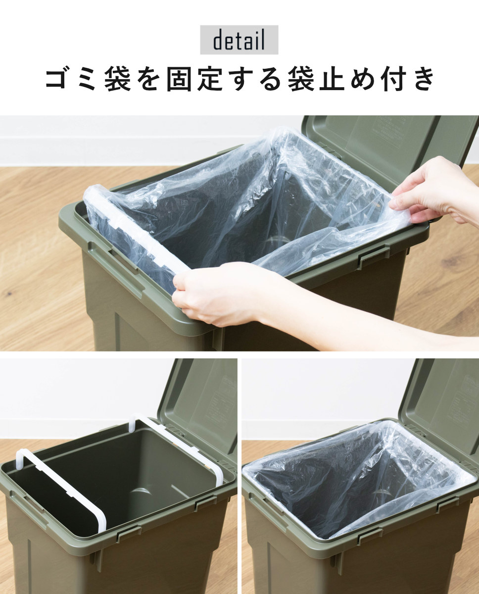 ゴミ袋を固定してズレ落ちを防止します。袋が外にはみ出さないので、生活感をオフできます。