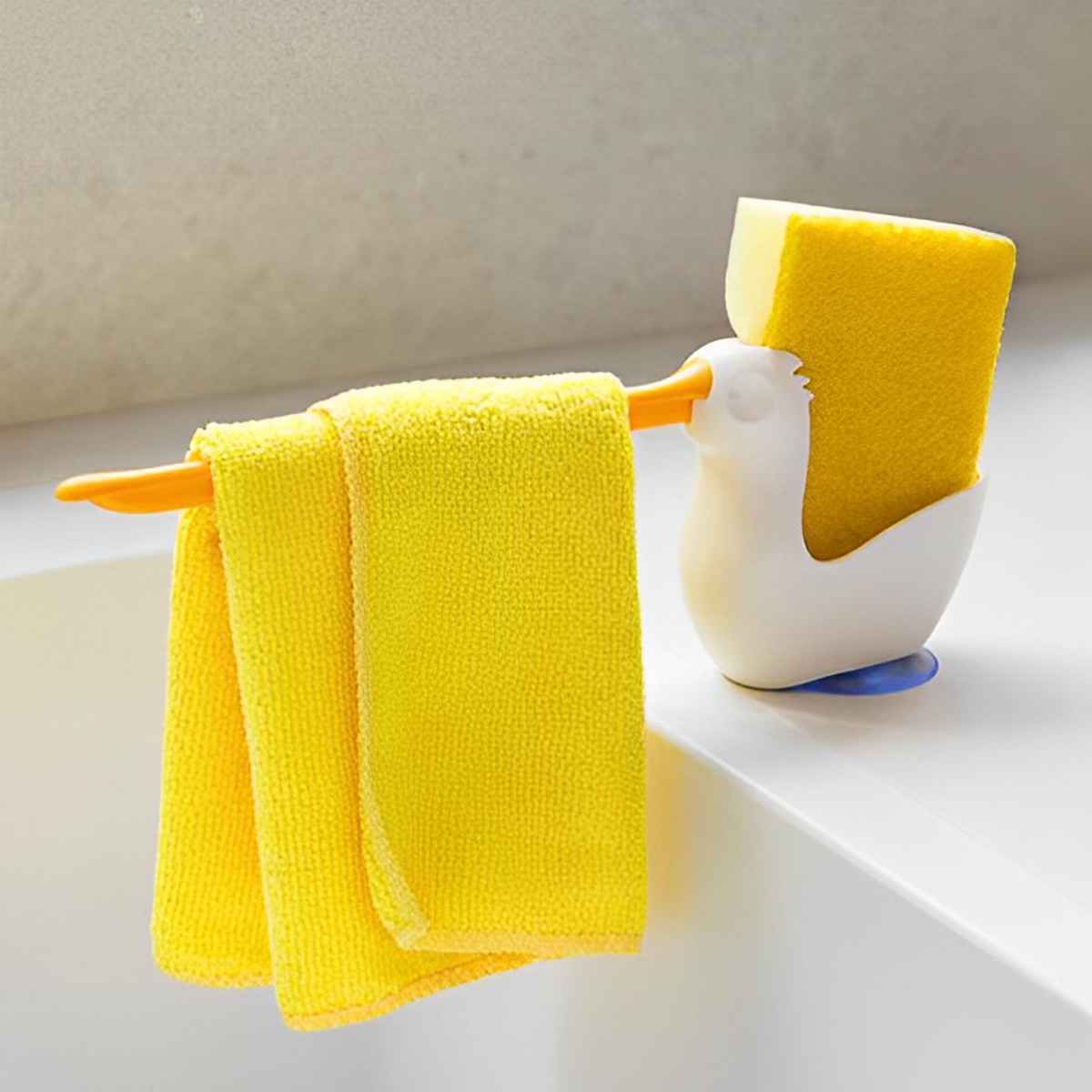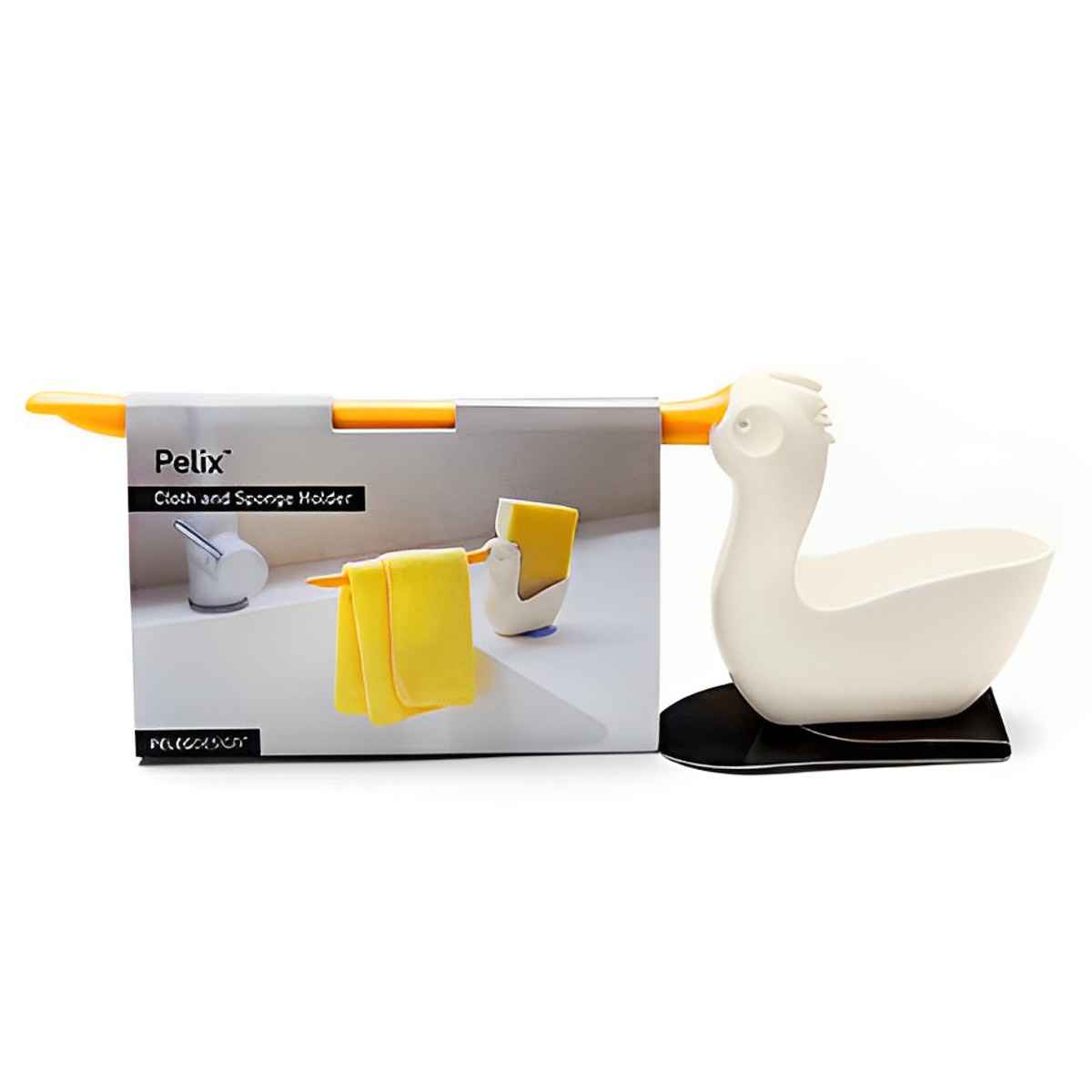 ペリカンの背中にスポンジ、長いクチバシにふきんを掛けることができるクロス&スポンジホルダーです。吸盤でしっかり固定でき、くるっと方向転換もできるのでシンクを使う時に邪魔になりません。シンク横にちょこんと座ってスマートに活躍してくれます。