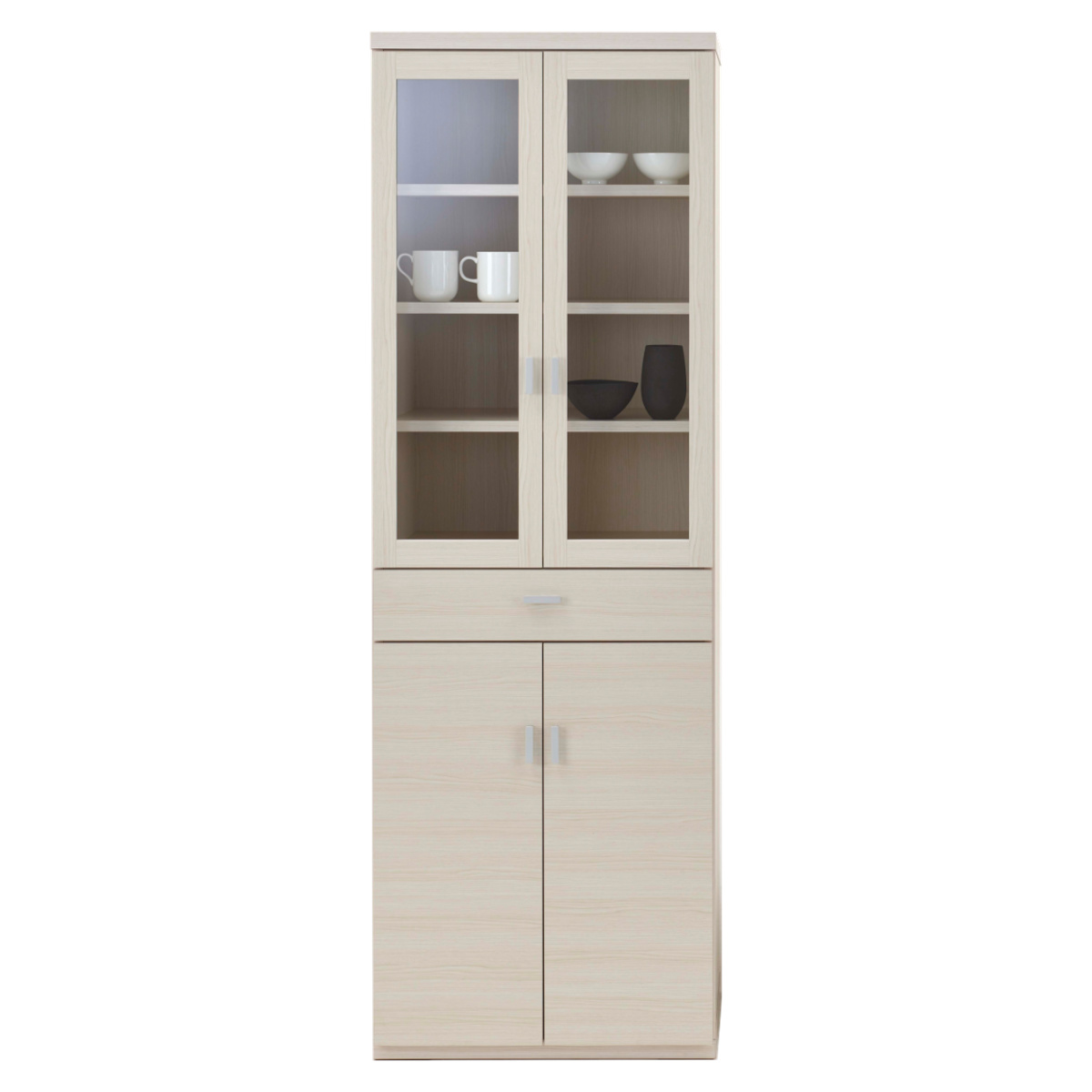 上段にはガラス扉収納付きです。よく使う食器やお気に入りの食器、小物などの収納におすすめです。可動棚なので収納物に合わせてお好みで高さを調整していただけます。