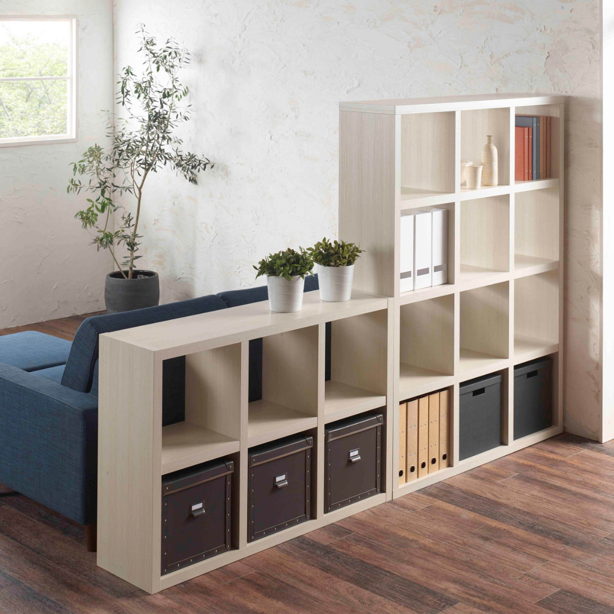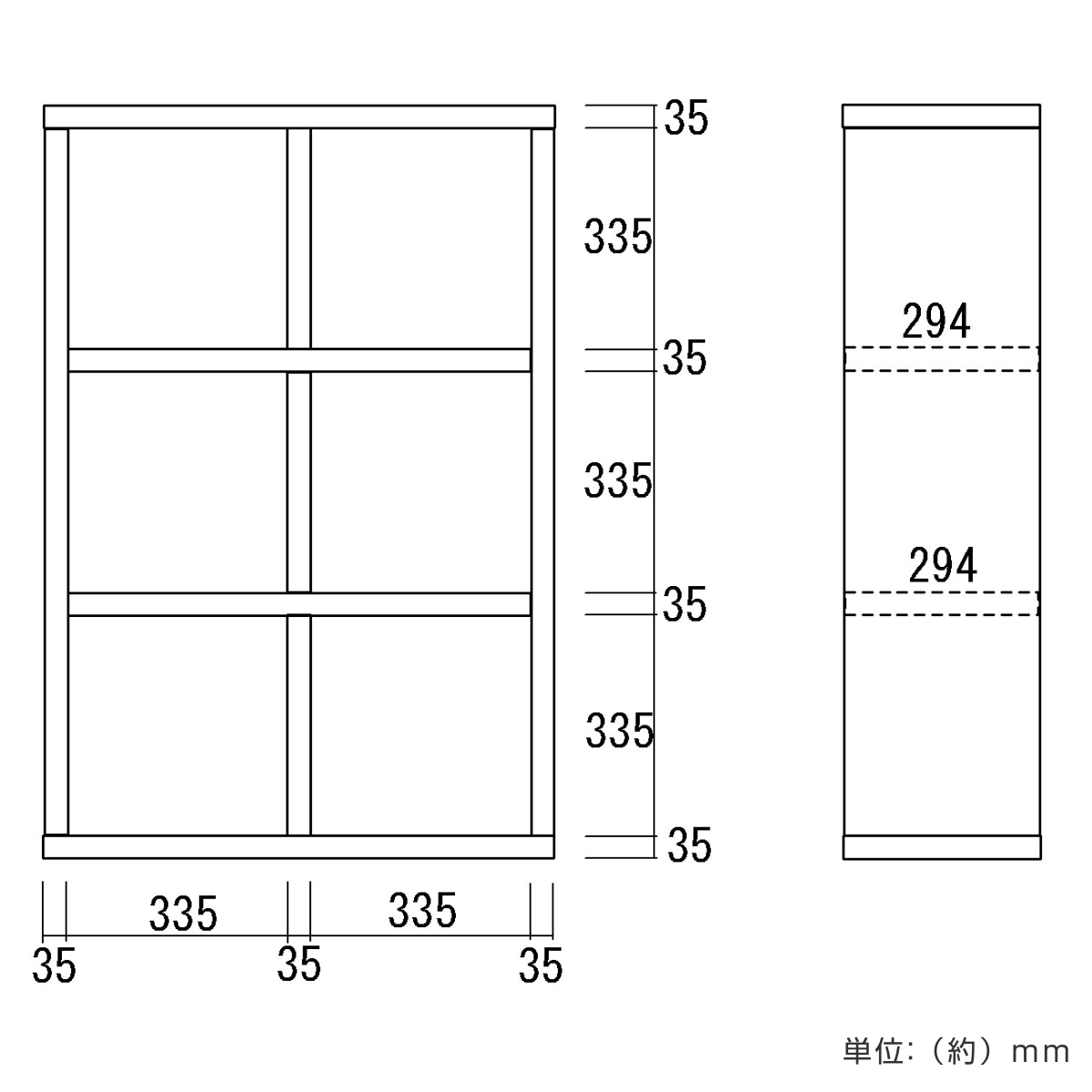 収納スペースは1マスあたり約幅33.5cm×高さ33.5cm(奥行き29.5cm)の正方形です。A4ファイルや雑誌が入る使いやすいサイズ設計なので、ご家庭の小物から資料類まですっきり収納することができます。
