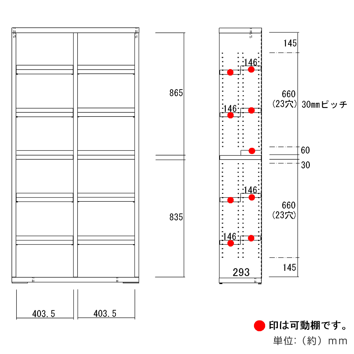 前後に分かれた2枚の棚板は、約3cmピッチで可動することができます。前の棚板を1段~2段下げる事により後に収納した物の背表紙も見え、大量の収納が可能です。