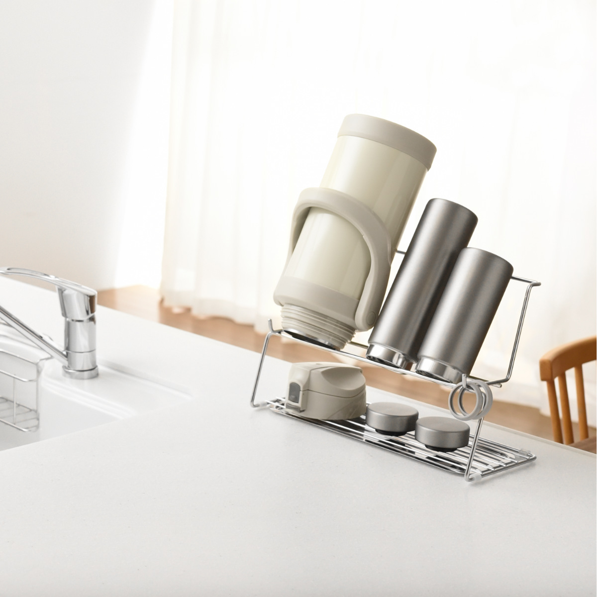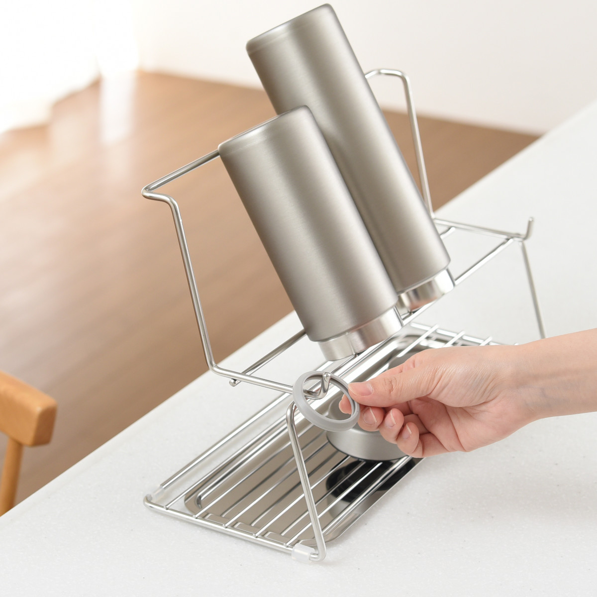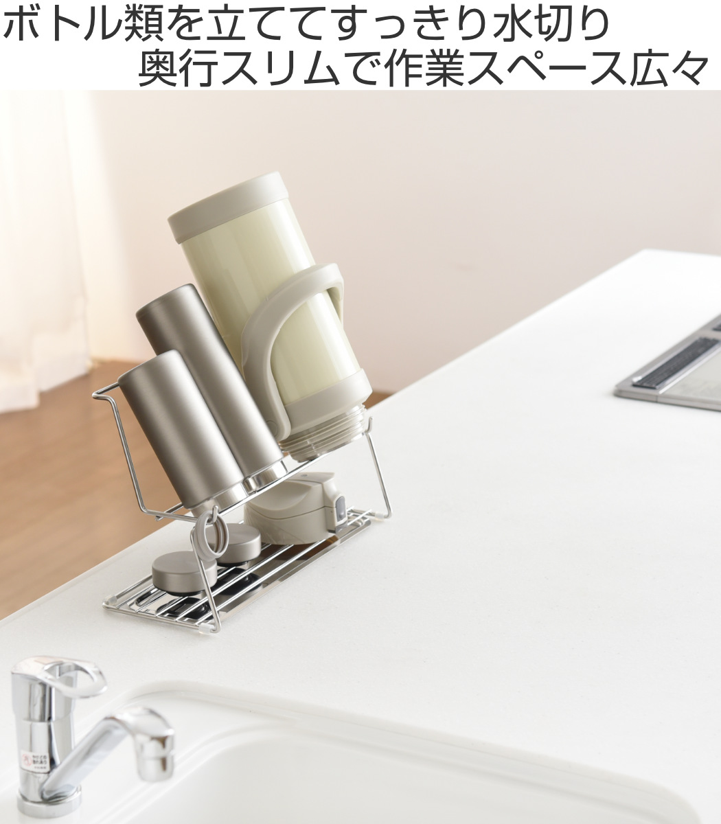 ボトル専用のステンレス製水切りラックです。食器類と同じラックだと、しっかり立てられず置き方に困るボトル類を、すっきりと立てて水切りできます。奥行スリムでキッチンを圧迫せず、省スペースですっきりと整頓できます。