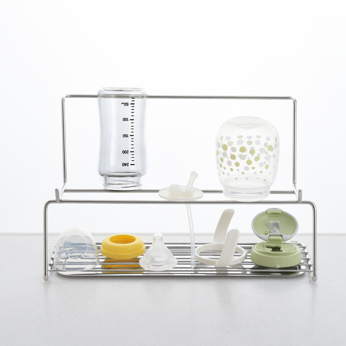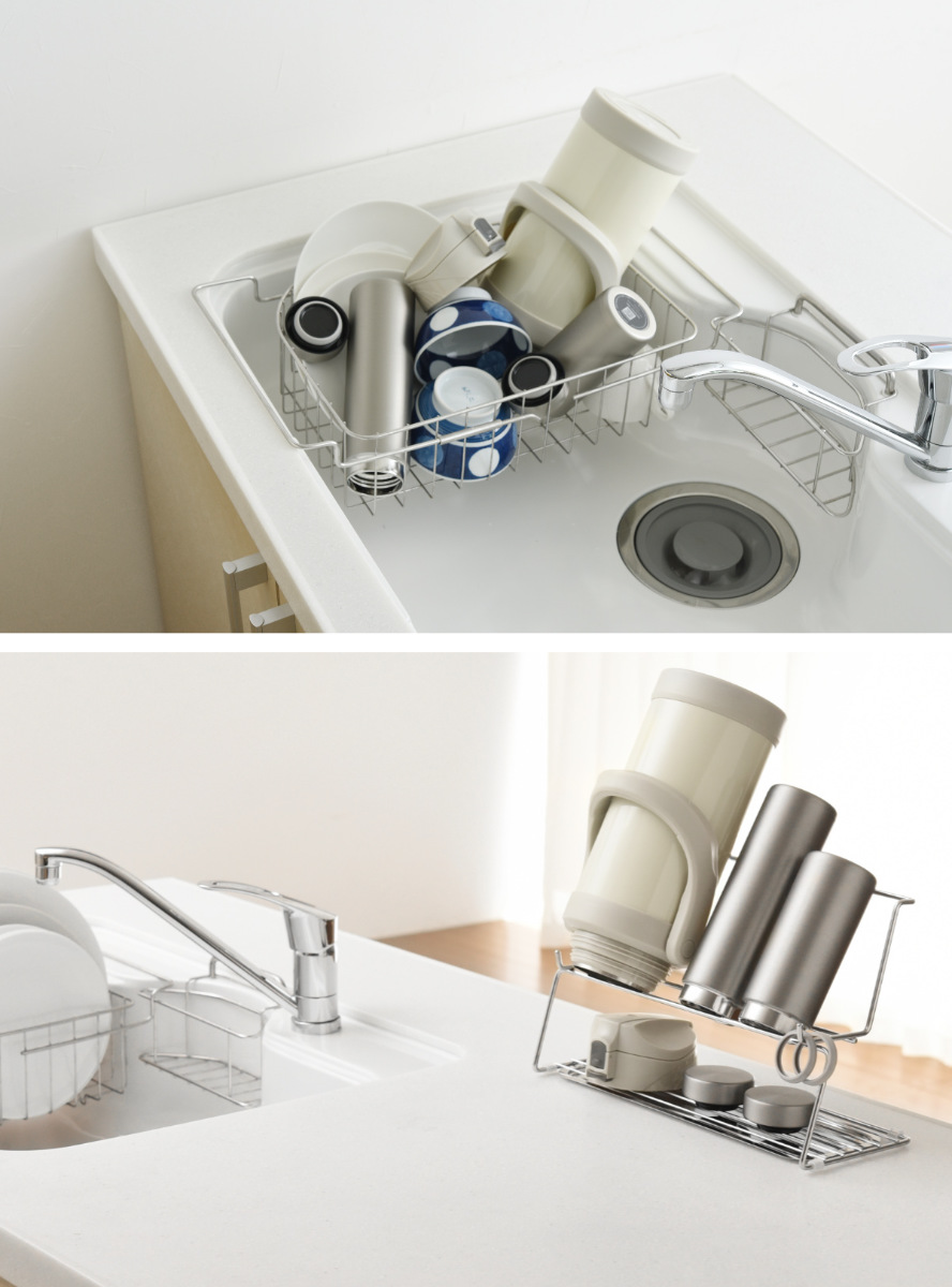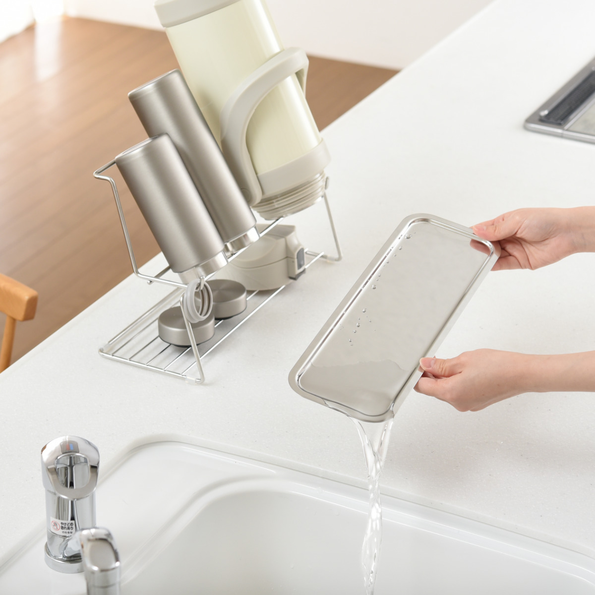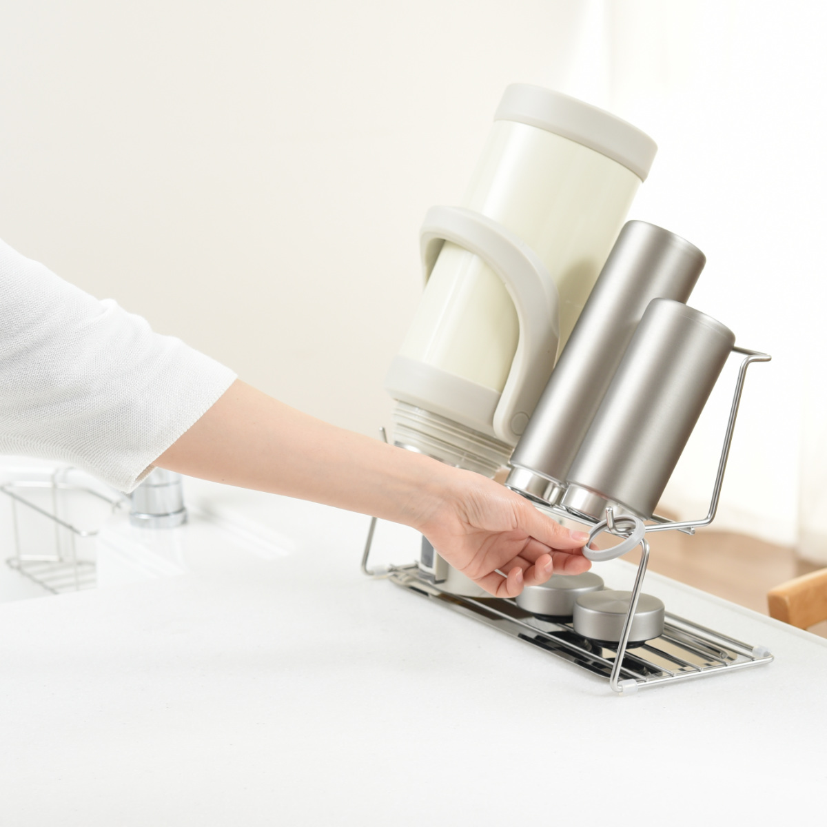 ボトル専用のステンレス製水切りラックです。食器類と同じラックだと、しっかり立てられず置き方に困るボトル類を、すっきりと立てて水切りできます。奥行スリムでキッチンを圧迫せず、省スペースですっきりと整頓できます。