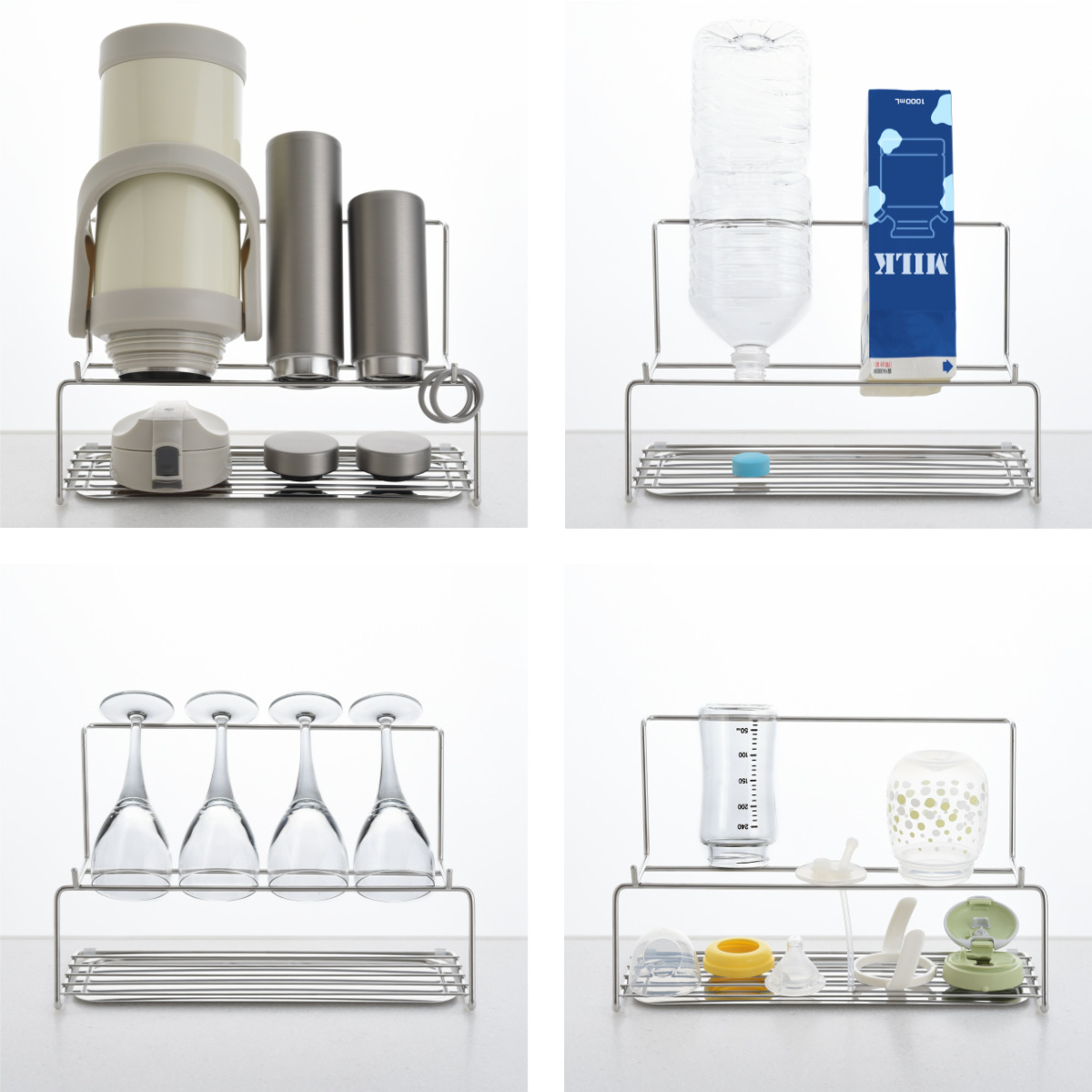 ボトル以外に、グラスや茶碗などの食器類、ペットボトルやパックドリンクの水切りにも使いやすいです。幅ワイド設計なので意外とたくさん置けて、収納力抜群。下段には蓋やパッキンなどの細々としたパーツを置いて水切りできます。