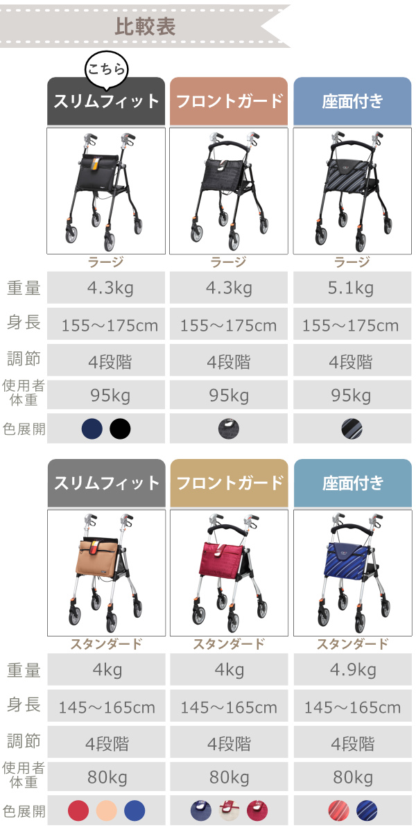 ![]() スリムフィット スタンダード | ![]() フロントガードタイプ スタンダード | ![]() 座面付きタイプ スタンダード |