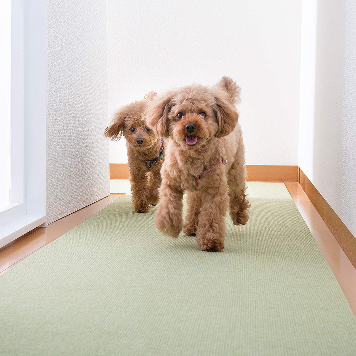 ペットがフローリング床の上を歩くと、ツルツル滑って足腰に負担がかかりケガの原因になります。マットを敷くことで滑りにくくなり、ペットの身体への負担を軽減します。
