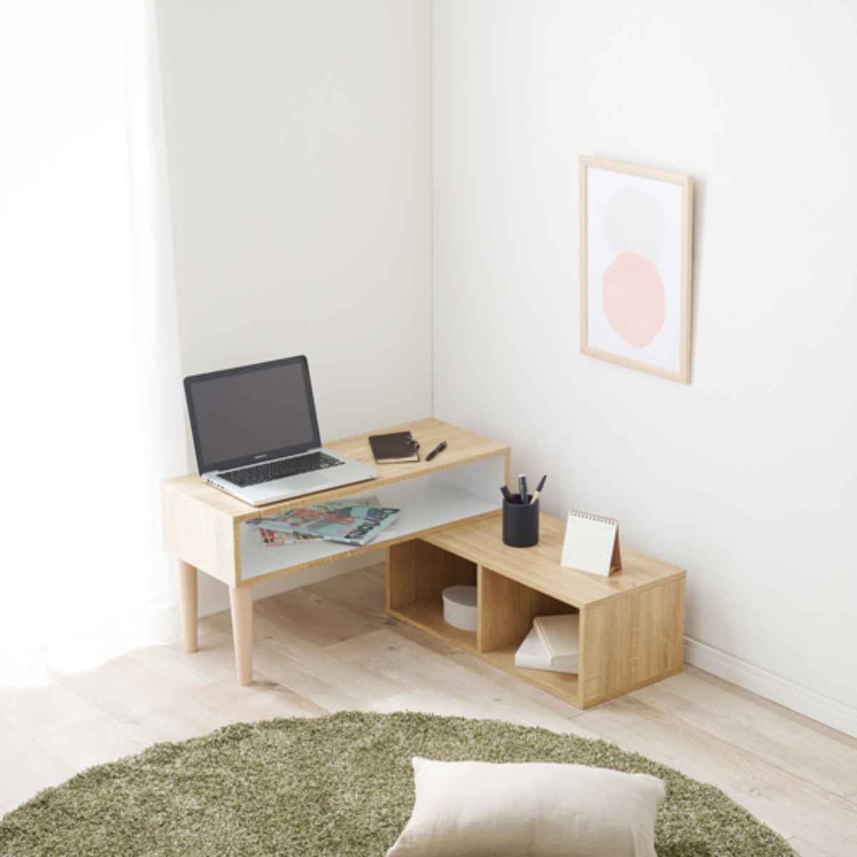 L字に変形できるのでデッドスペースになりやすいお部屋のコーナー部分にスッキリ設置できます。パソコンを置けば作業机になります。