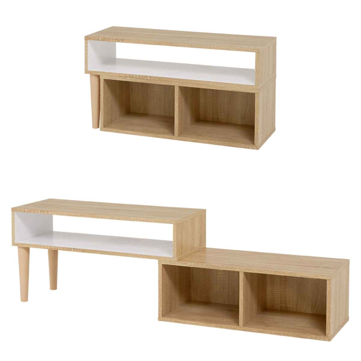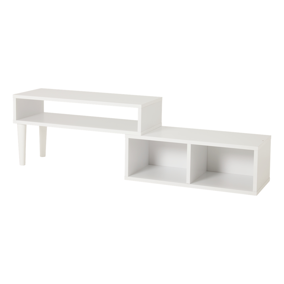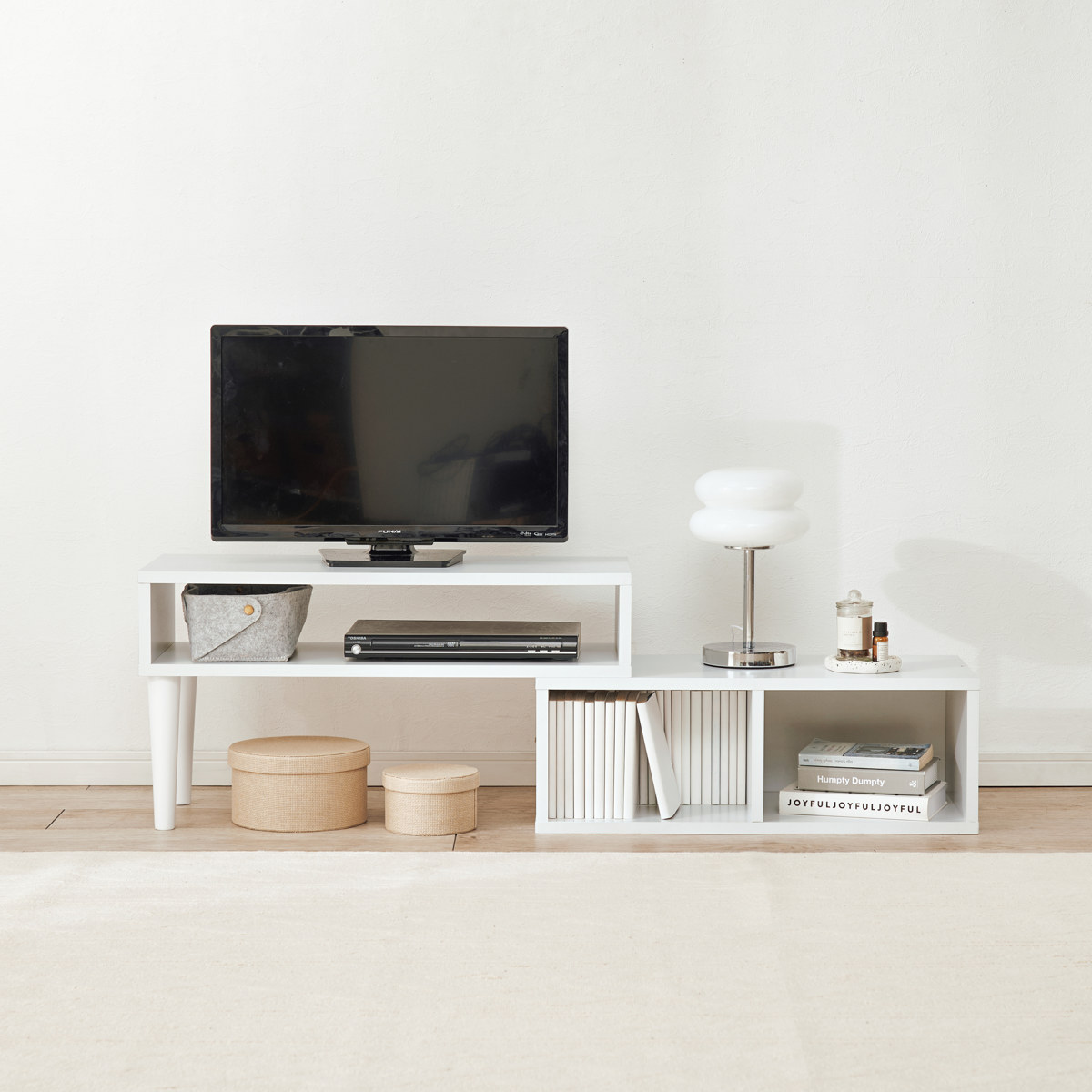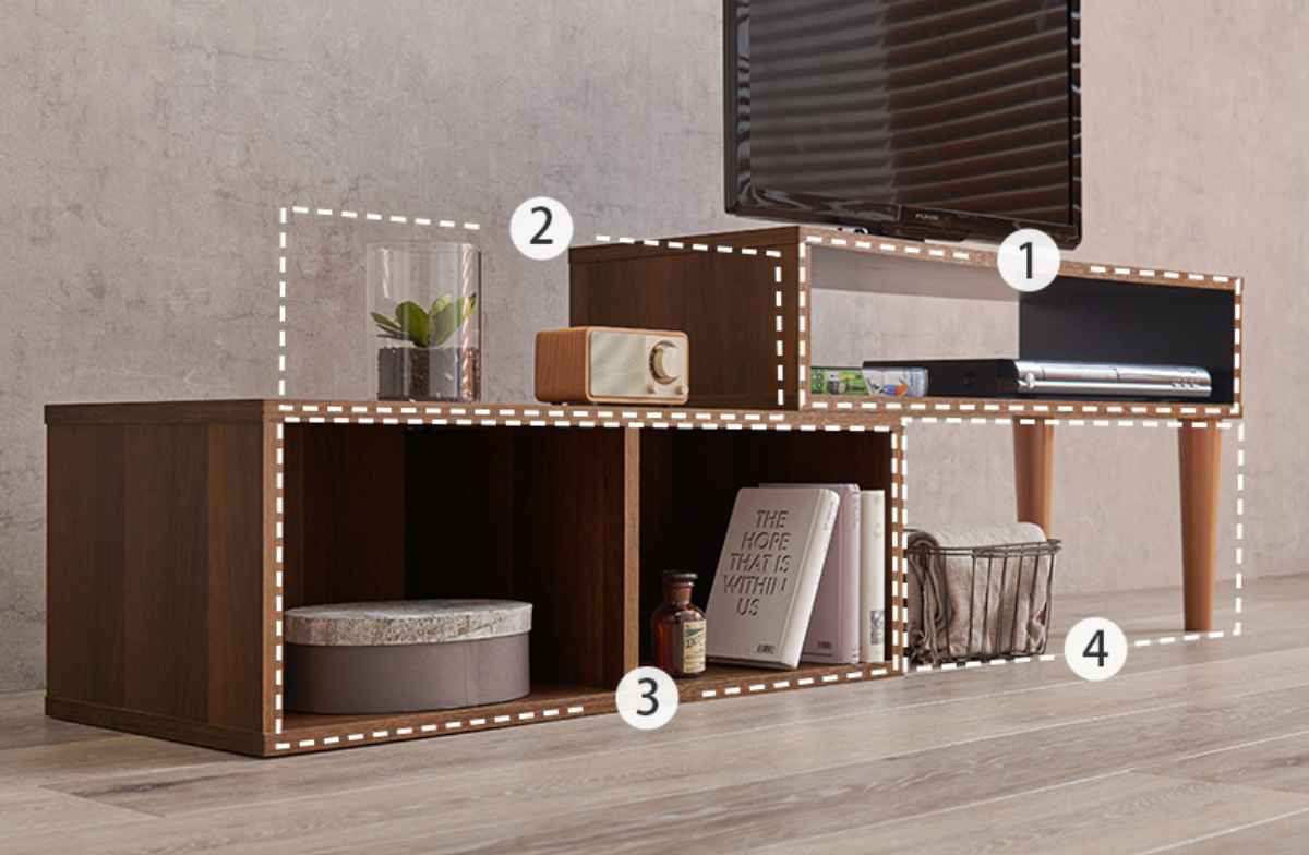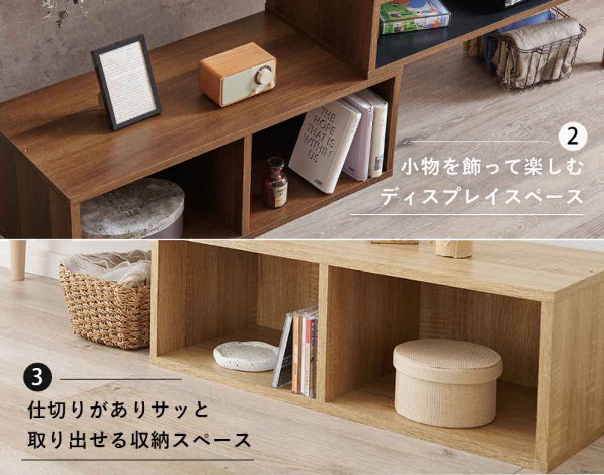 テレビ台を伸ばすとディスプレイスペースが登場し、小物を飾って楽しむことができます。また、下段の仕切りのあるスペースにはCDや本を入れたり、ディスプレイスペースとしてもお使いいただけます。