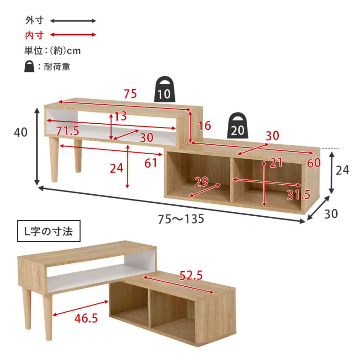 - 約幅75~135×奥行30×高さ40cm