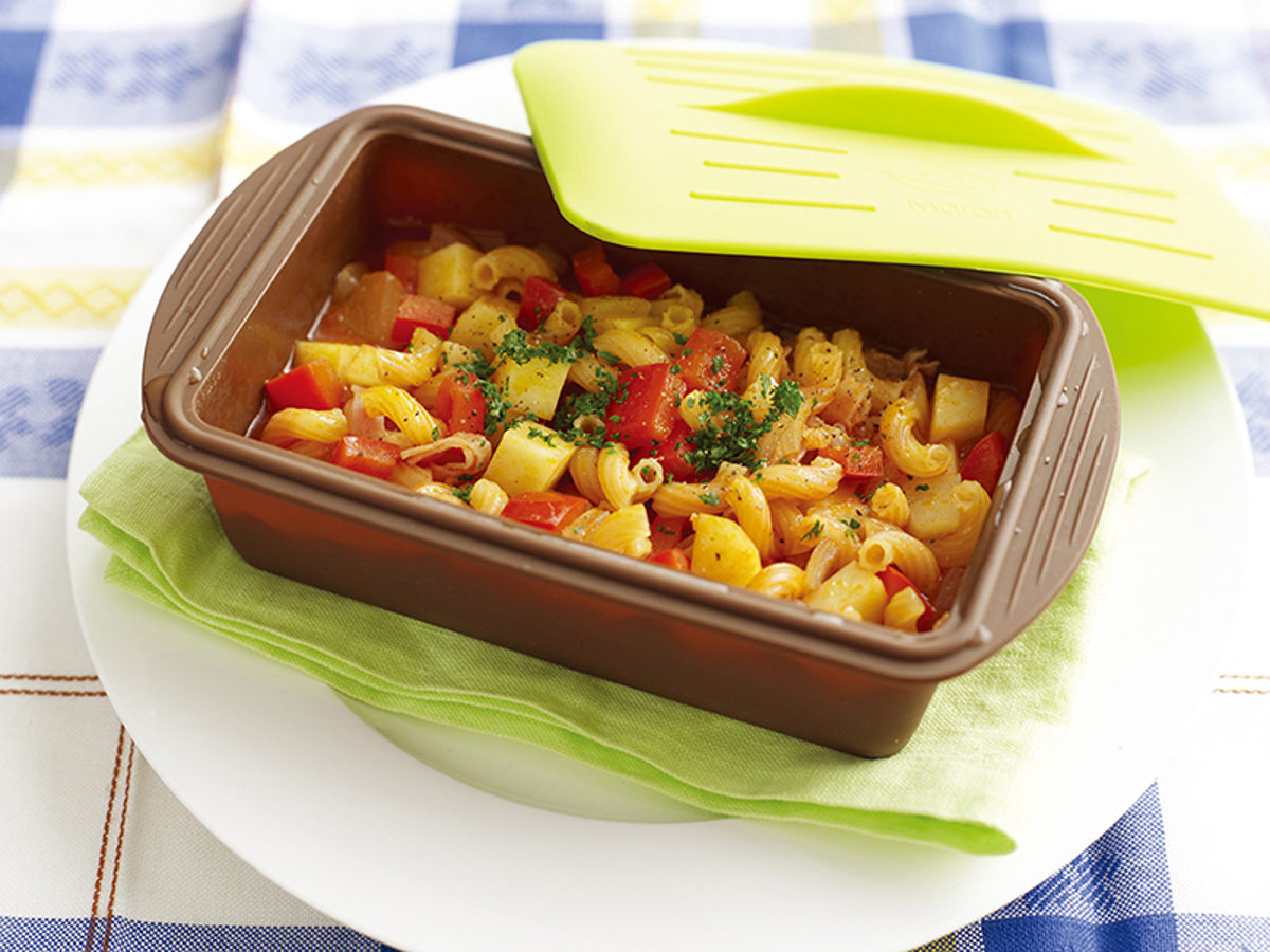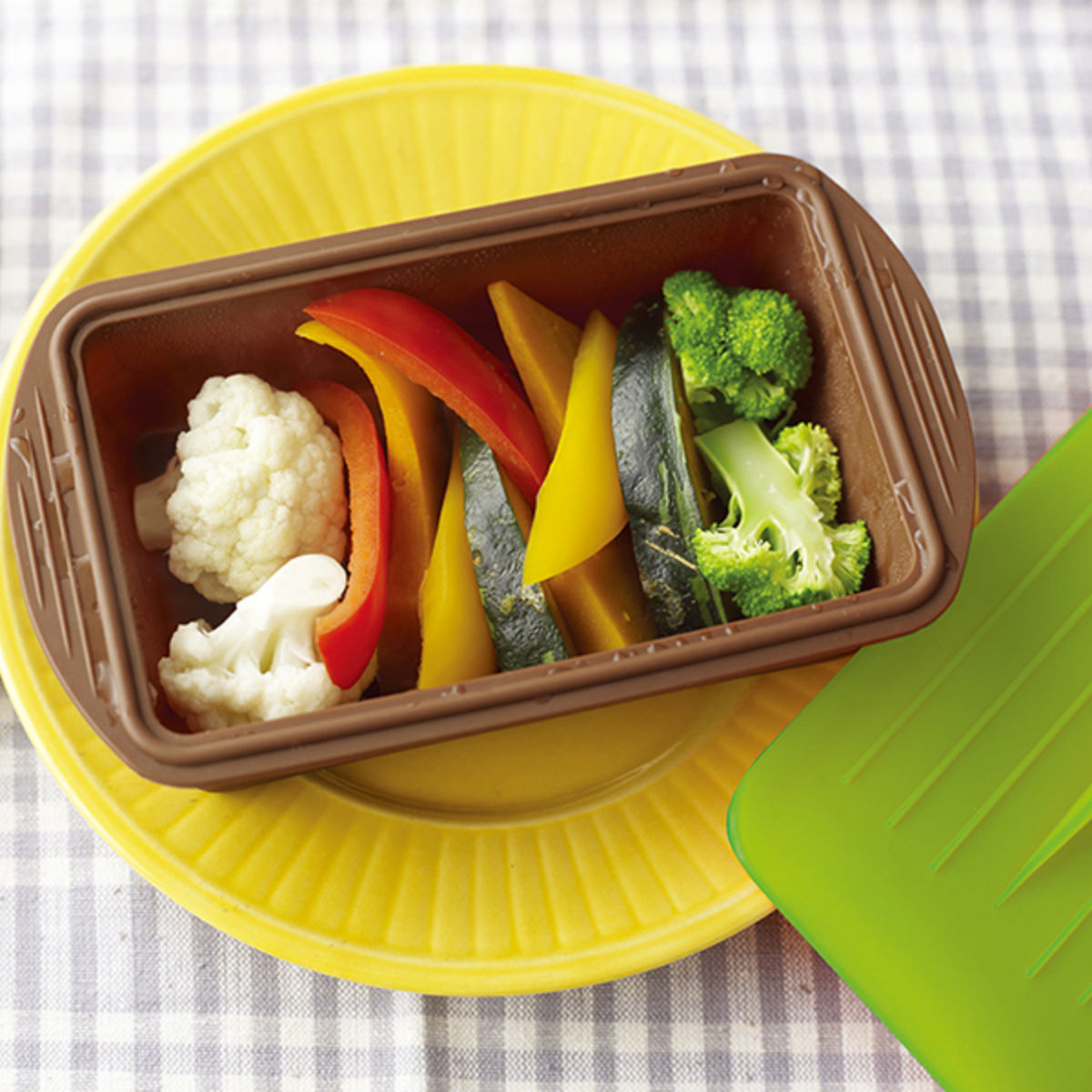 フードスタイリスト「マロンさん」オリジナルカラーのシリコンクッカーです。食材を入れて電子レンジで加熱するだけで、簡単に蒸し料理ができ上がります。マロンさんのミニレシピ付きです。
