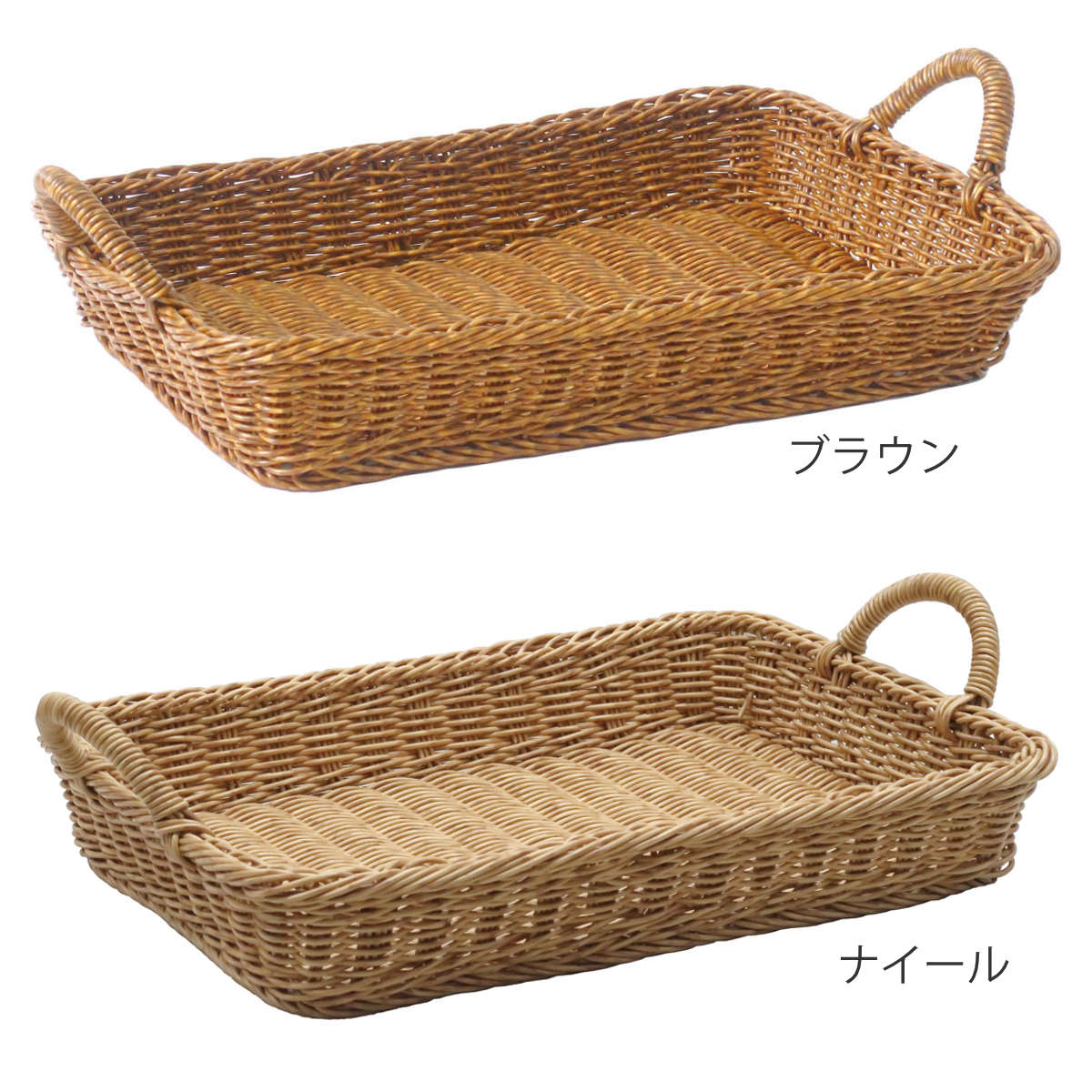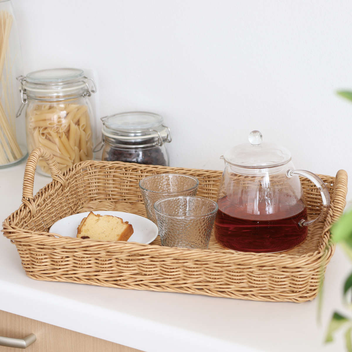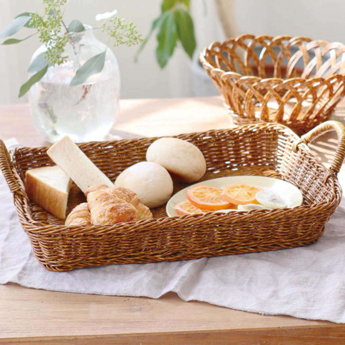 汚れたらさっと水拭きできる、キッチン収納に最適なポリプロピレン製のトレイです。見た目はまるで天然素材のようなおしゃれさで、パンやお菓子を入れて食卓に出してもおしゃれです。