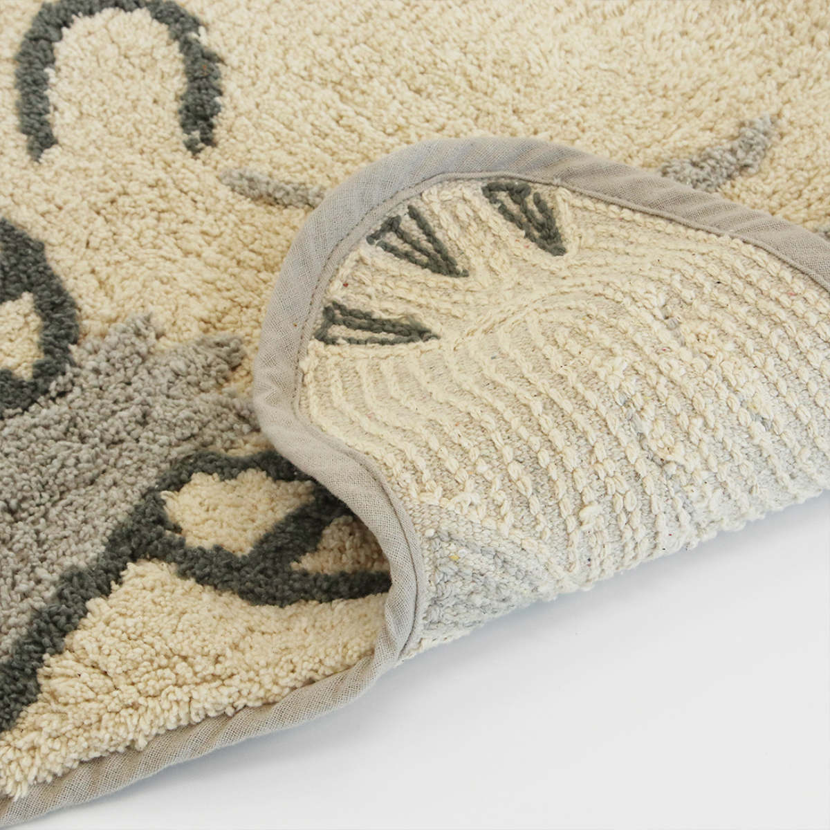 ふんわり柔らかな踏み心地で、素足で歩いても嬉しい心地よさです。裏面は表面と同じコットン素材でフローリング等を傷つけにくいです。