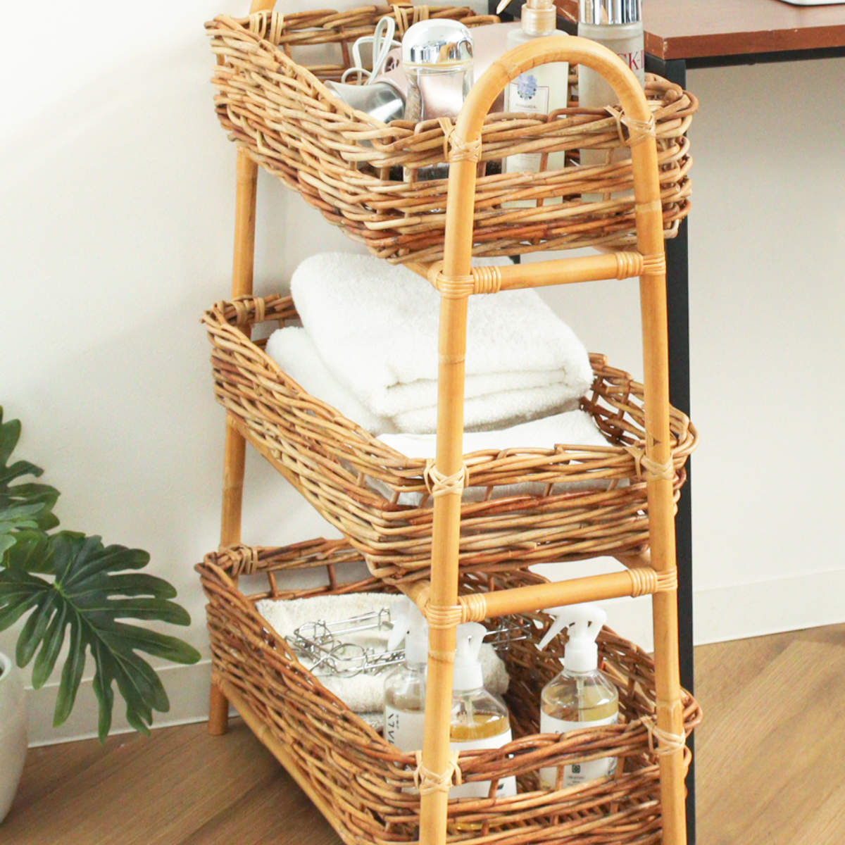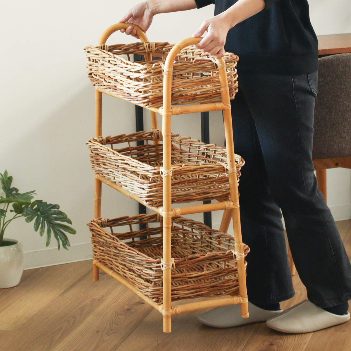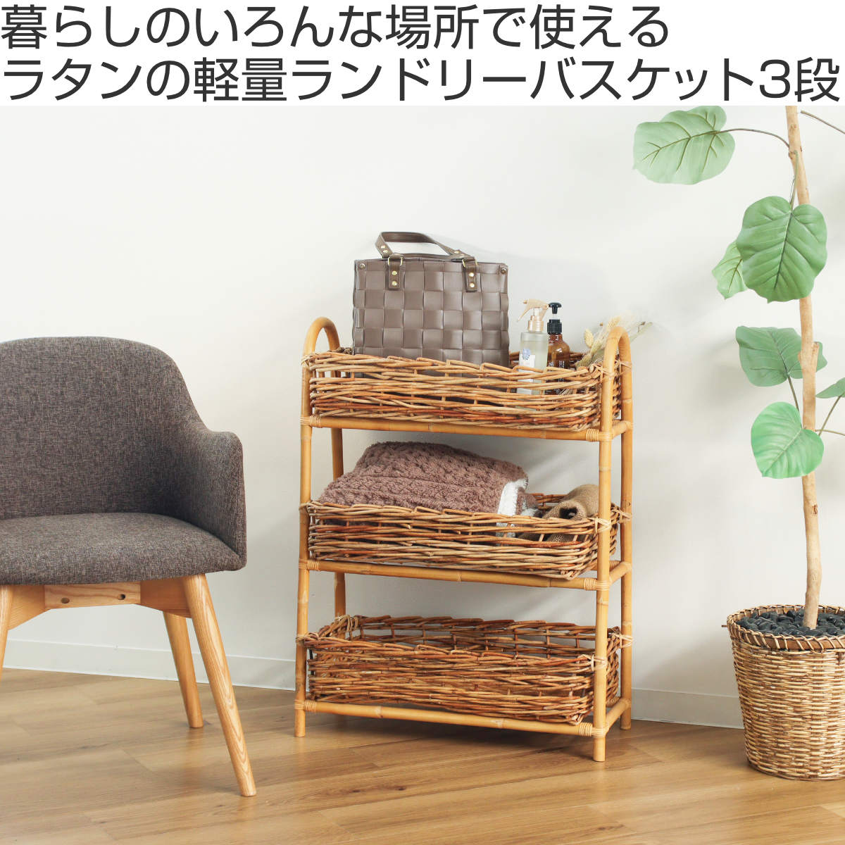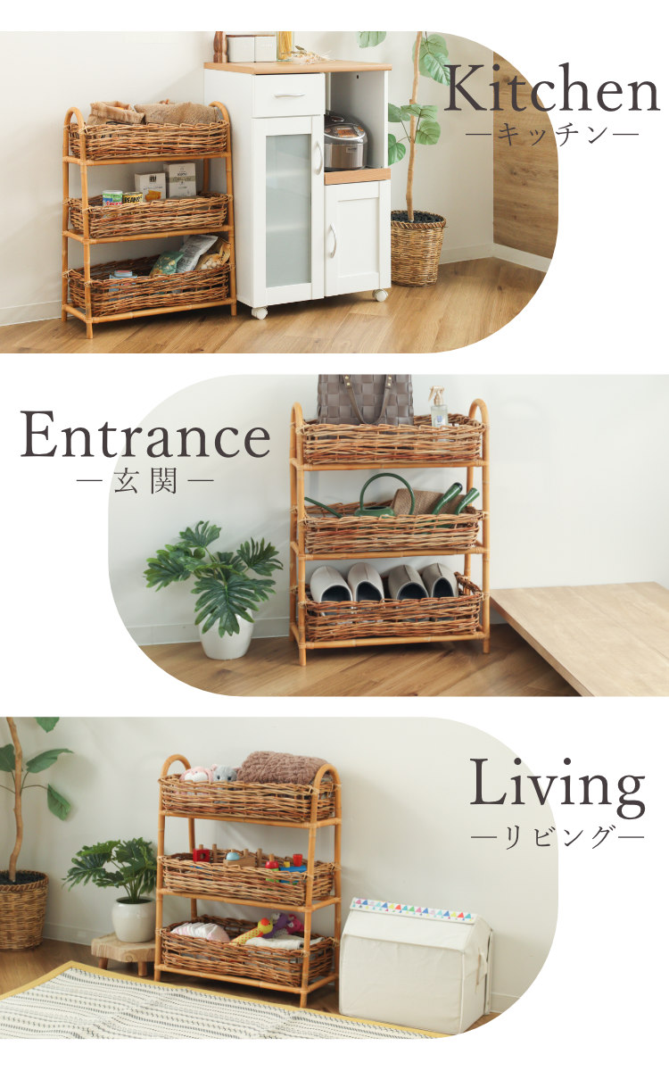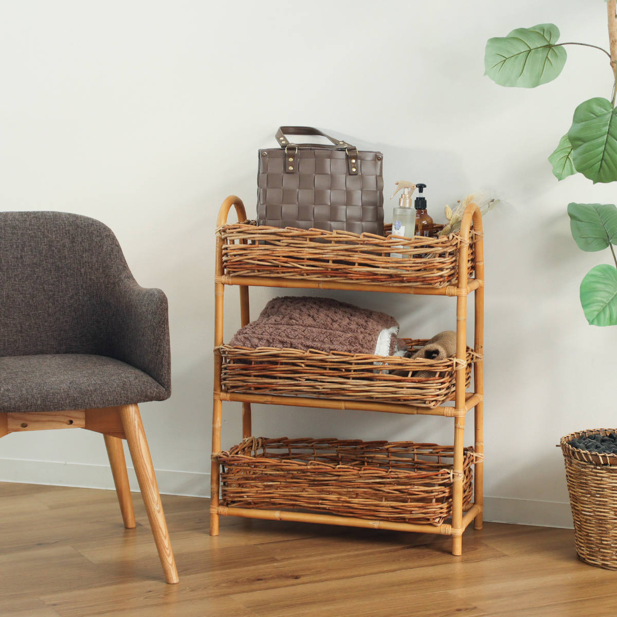 散らかりがちなアイテムをスッキリ収納できる、ラタン製の3段バスケットです。自然素材ならではの温かな風合いを活かしたデザインで、収納しながら空間をおしゃれに演出します。