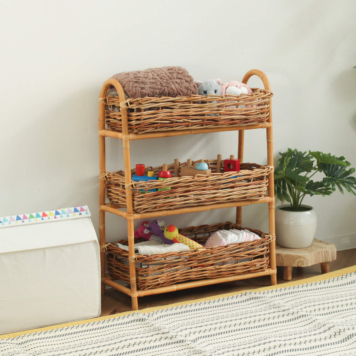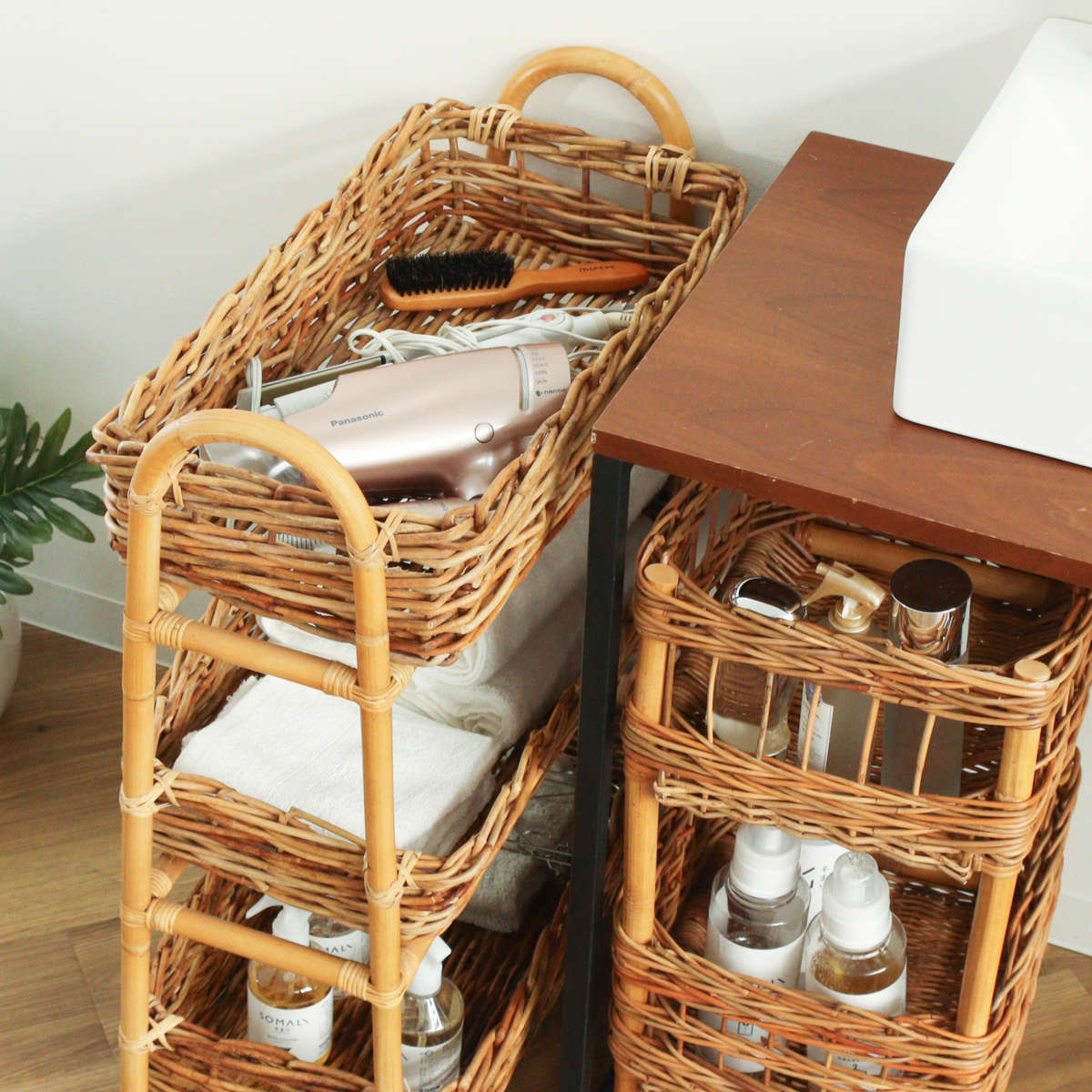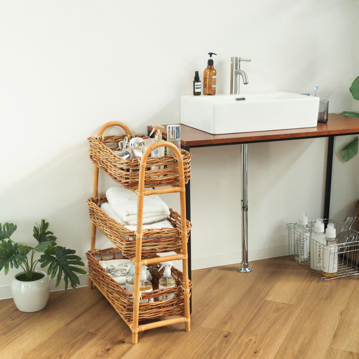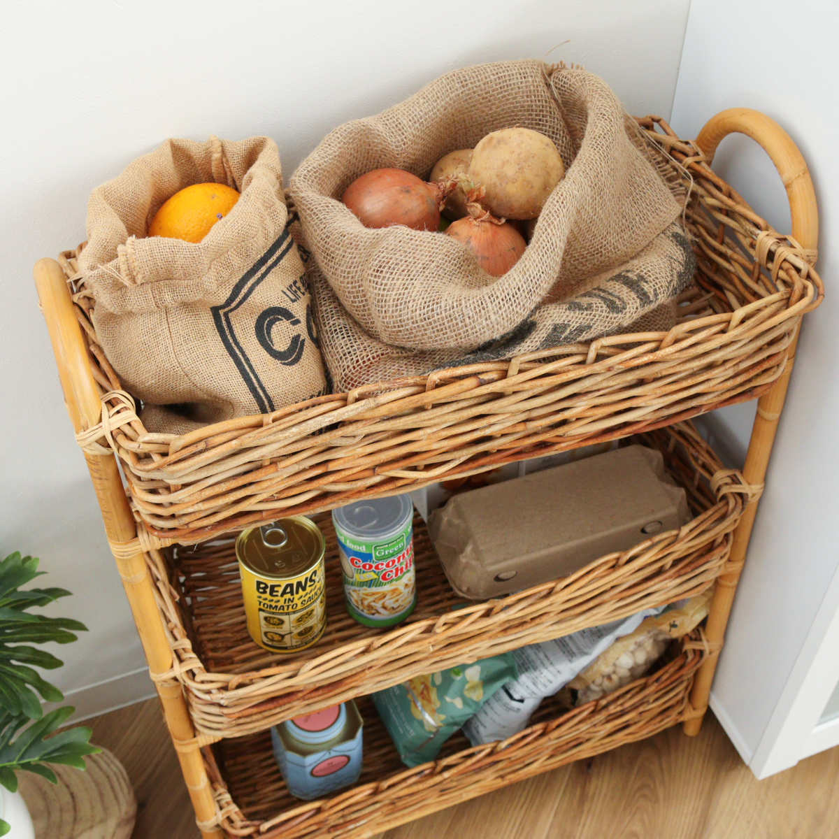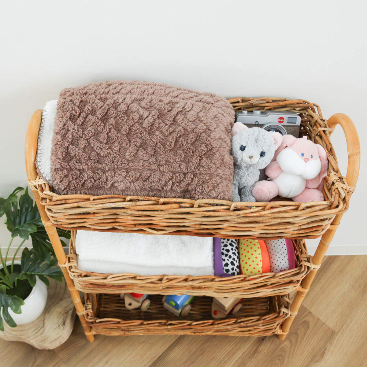 散らかりがちなアイテムをスッキリ収納できる、ラタン製の3段バスケットです。自然素材ならではの温かな風合いを活かしたデザインで、収納しながら空間をおしゃれに演出します。