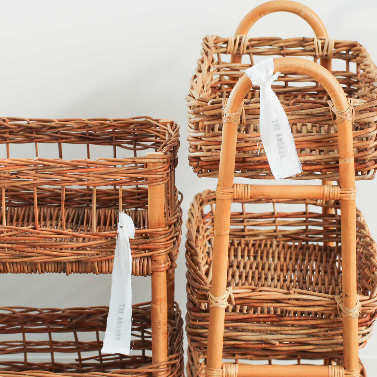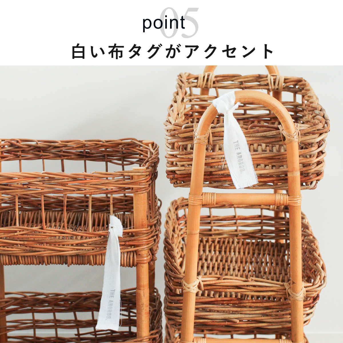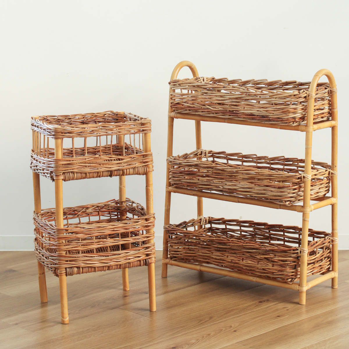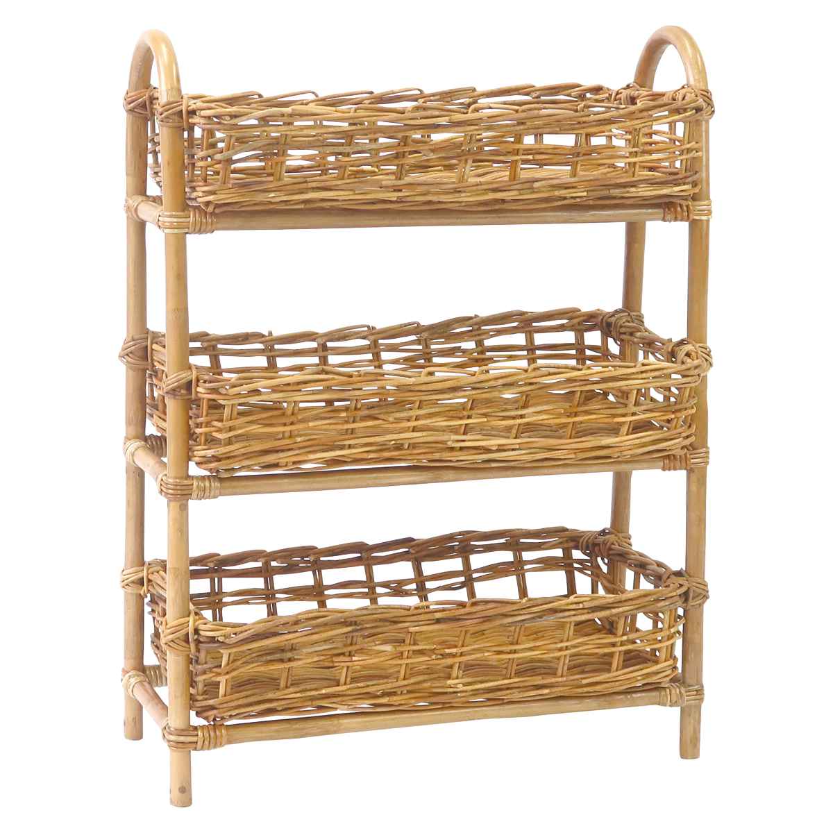 風合い豊かな皮つきラタンの3段バスケット
