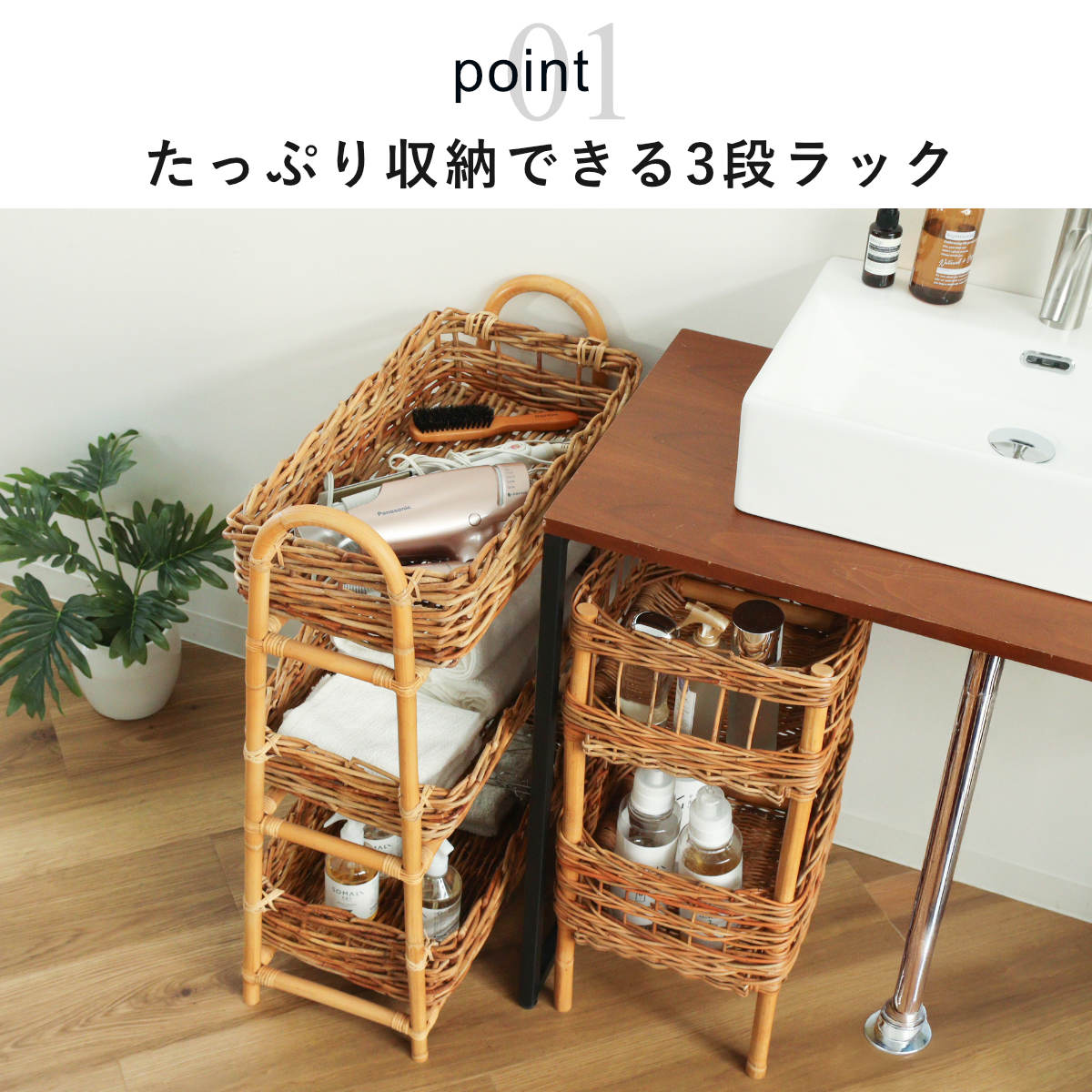 たっぷり収納できる3段バスケット