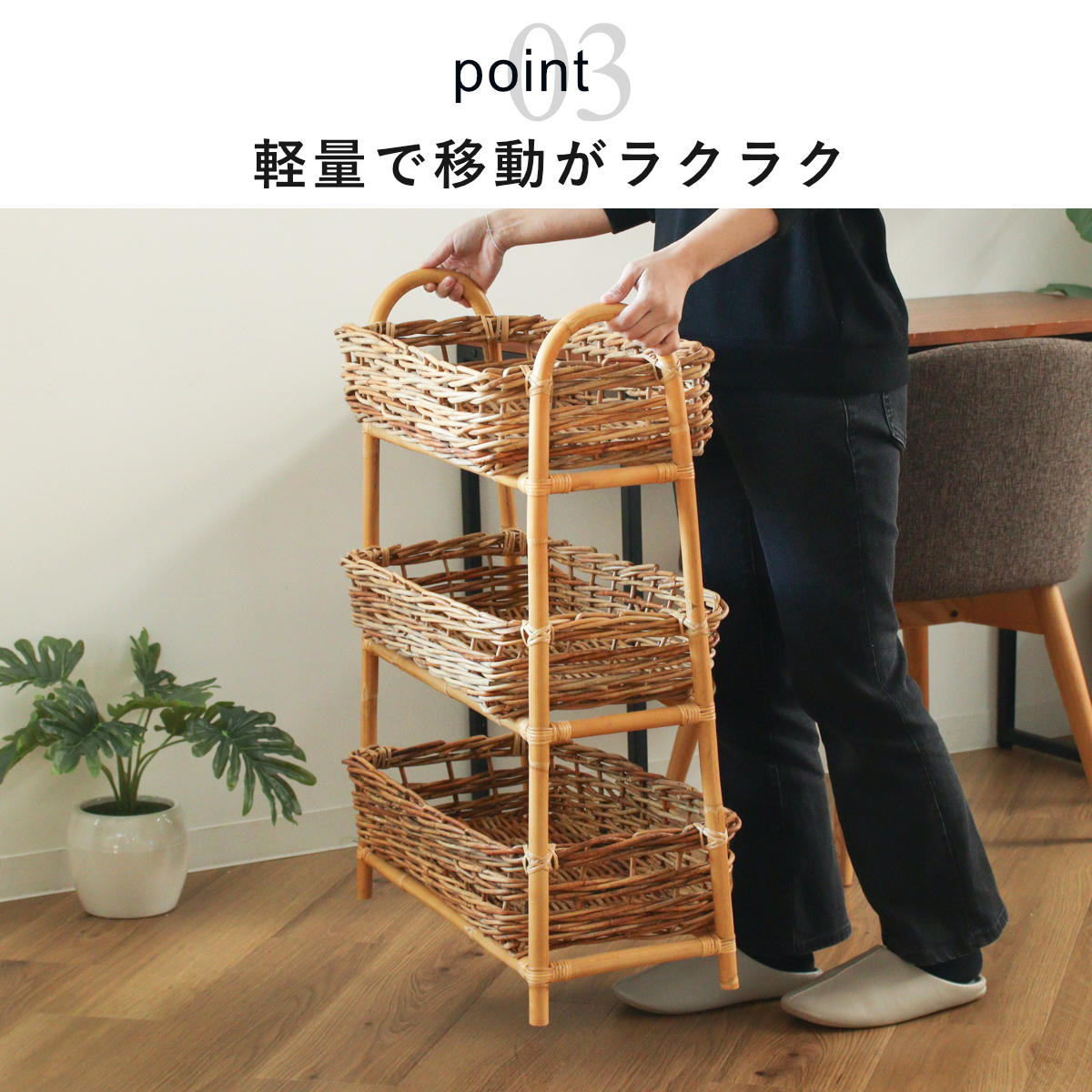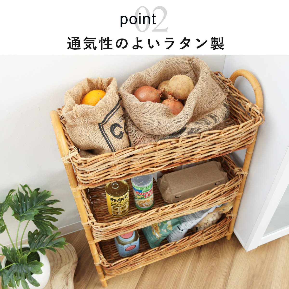 吸湿性と通気性に優れたラタン素材を使用しているため、キッチンや洗面所などにも気軽に置いていただけます。植物を飾るプランターとして使うのもおすすめです。