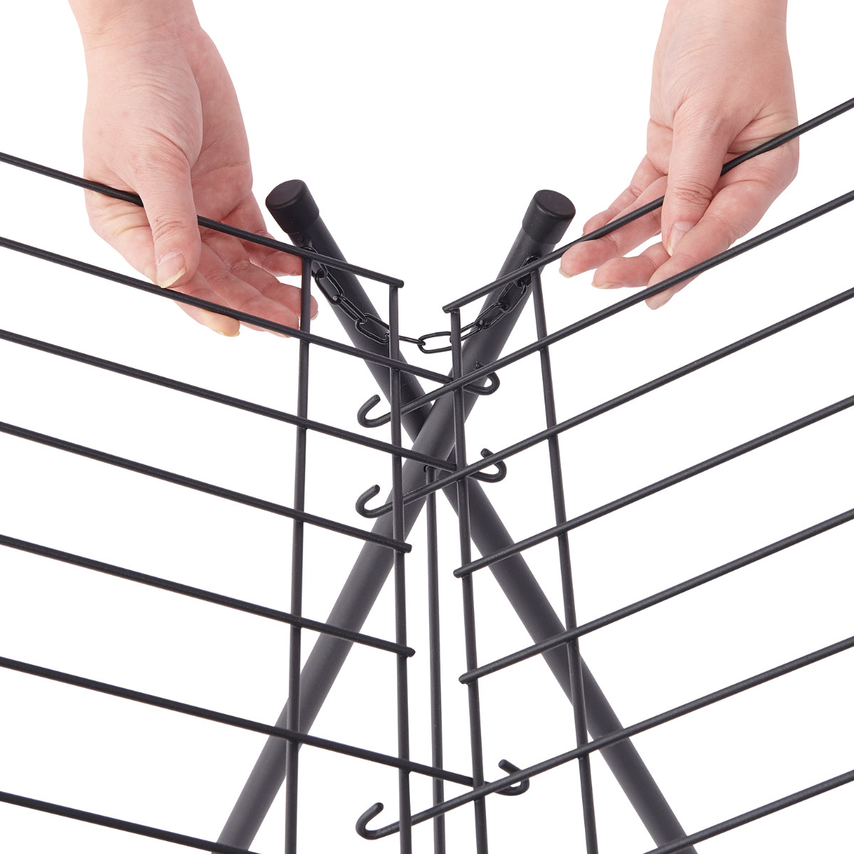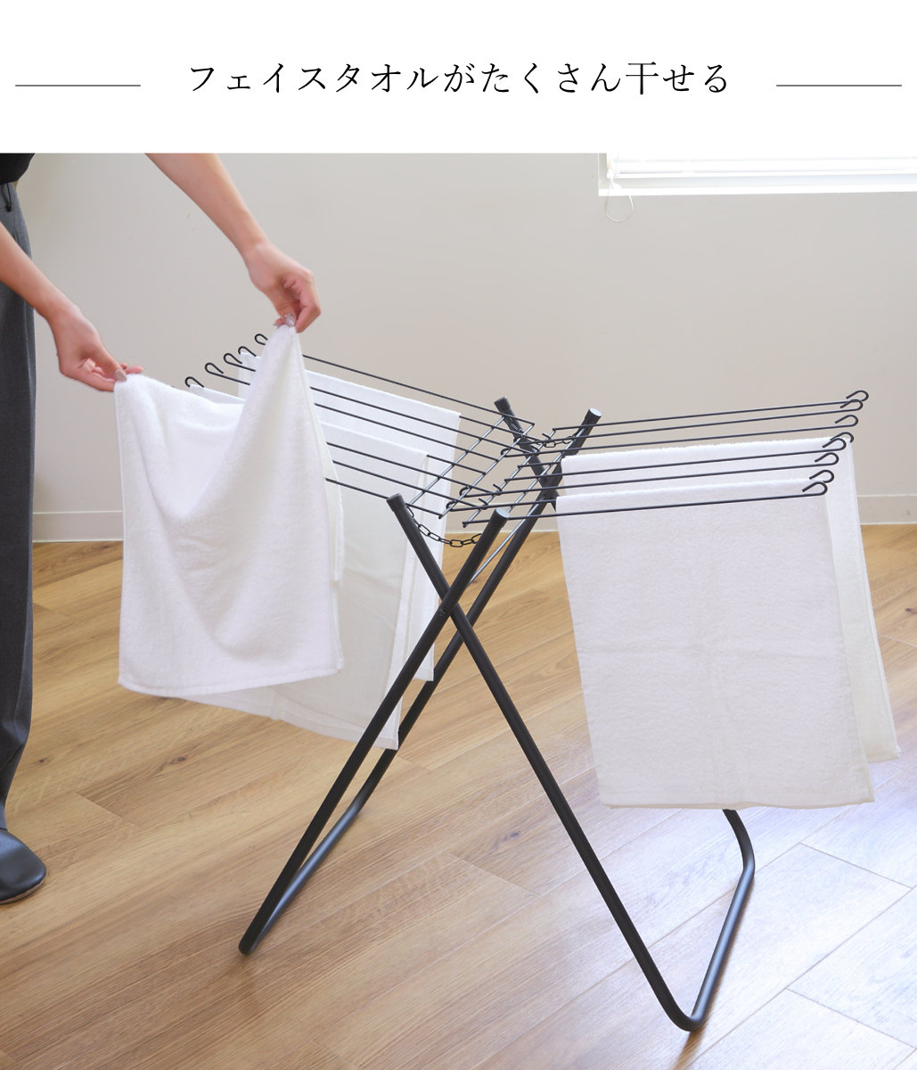 フェイスタオルが16枚干せるタオルスタンドです。タオルバーの先端は、タオルが飛んでいかないようにしっかり止められるクリップ状になっています。一度にたくさんのタオルが干せるので、タオルのお洗濯回数が多いご家庭や美容室などの店舗に最適です。
