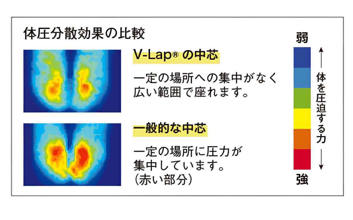 反発性が高く上下からの圧力に強いため、クッション材のへたりが少ないのが強みです。また、縦方向の縦繊維構造で水分が逃げて乾きやすく、お尻が蒸れにくいので快適に過ごせます。