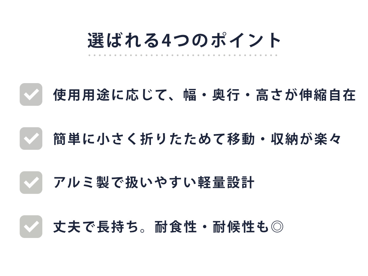 ![]() 伸縮タイプ レギュラー | ![]() 伸縮タイプ ワイド | ![]() コンパクトタイプ キャスター付き |