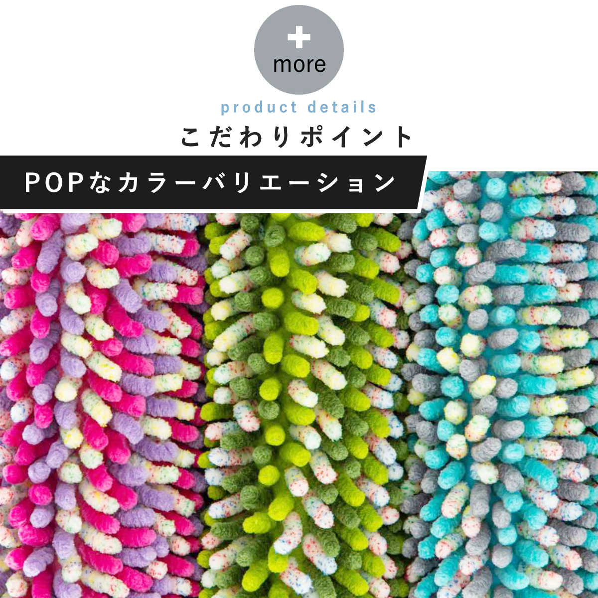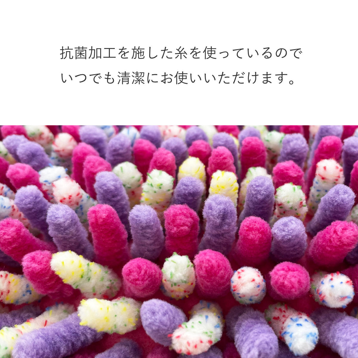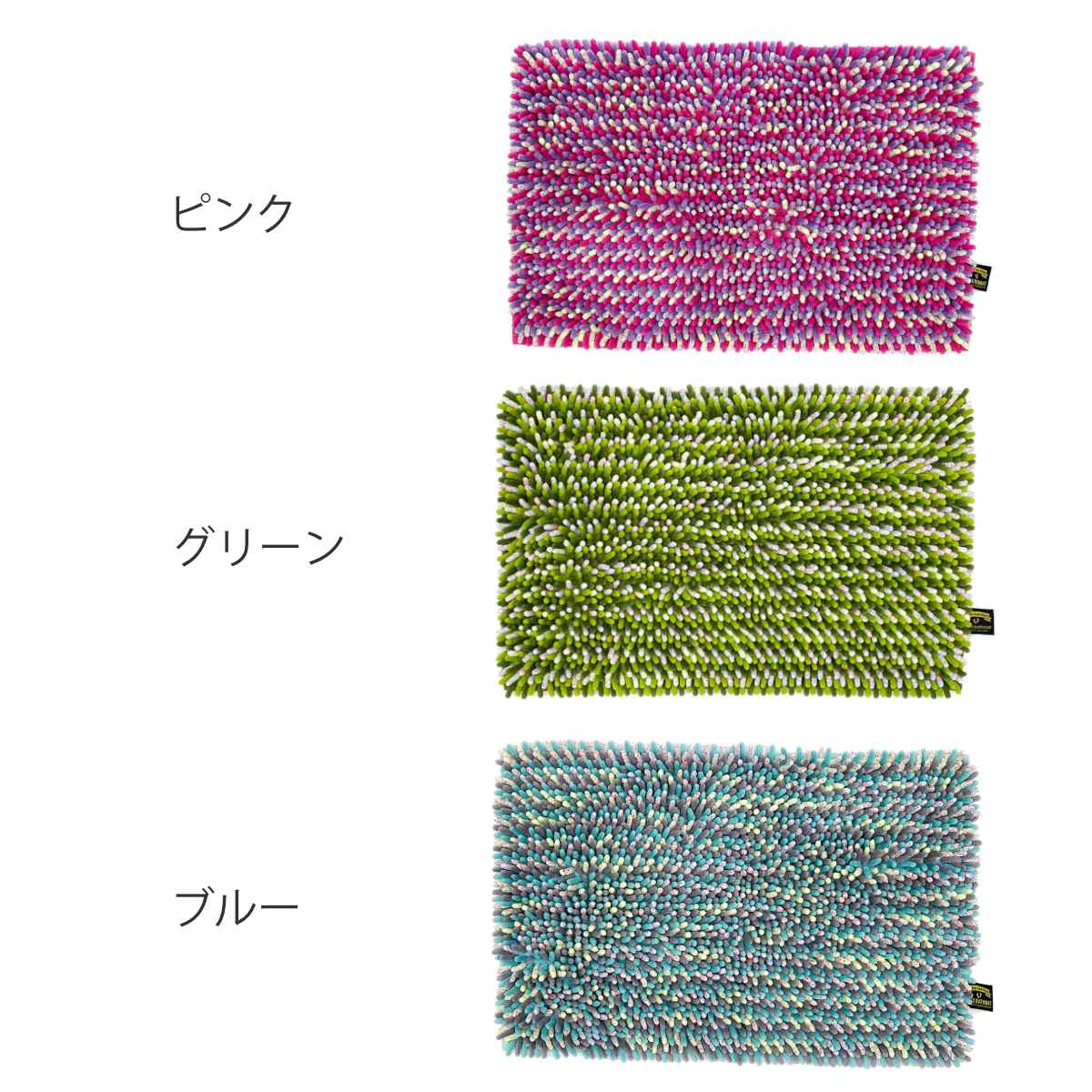 ピンク、グリーン、ブルーの3カラー展開です。ミックス糸を使用した立体感のあるデザインと明るいビビットカラーがバスルームのアクセントになります。マットを敷くだけでお風呂場が明るい雰囲気になります。
