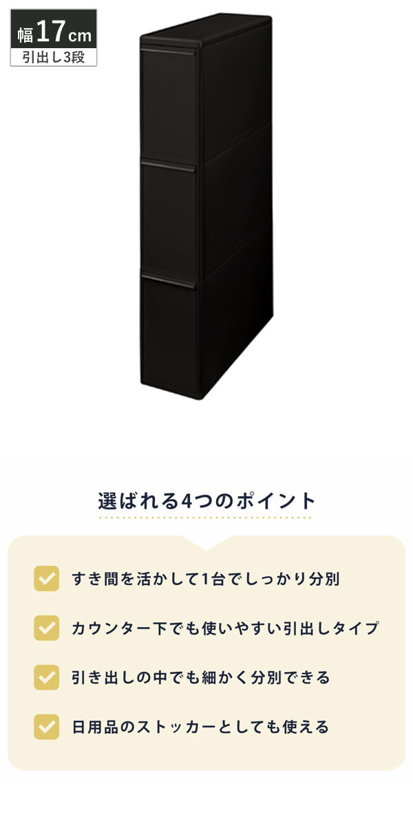 キッチンだけでなく、洗面台と洗濯機の間などでも使用可能で、ゴミ袋・洗剤・食品・ペットボトルなどの収納にもおすすめです。