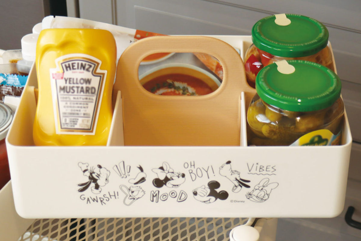 フタがないので背の高い調味料の容器やボトルも収納しやすくなっています。キッチンで使ったり、ダイニングテーブルにそのまま持っていったりと便利にお使いいただけます。