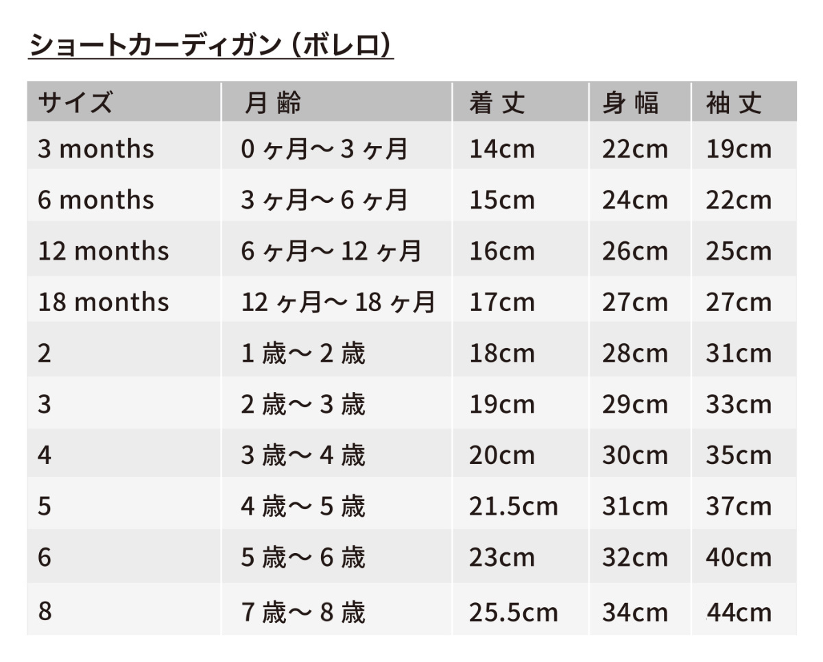 ![]() ショートカーディガン 6ヶ月~2歳 【▲このページの商品】 | ![]() ショートカーディガン 3歳~8歳 | ![]() カーディガン 0ヶ月~3歳 |