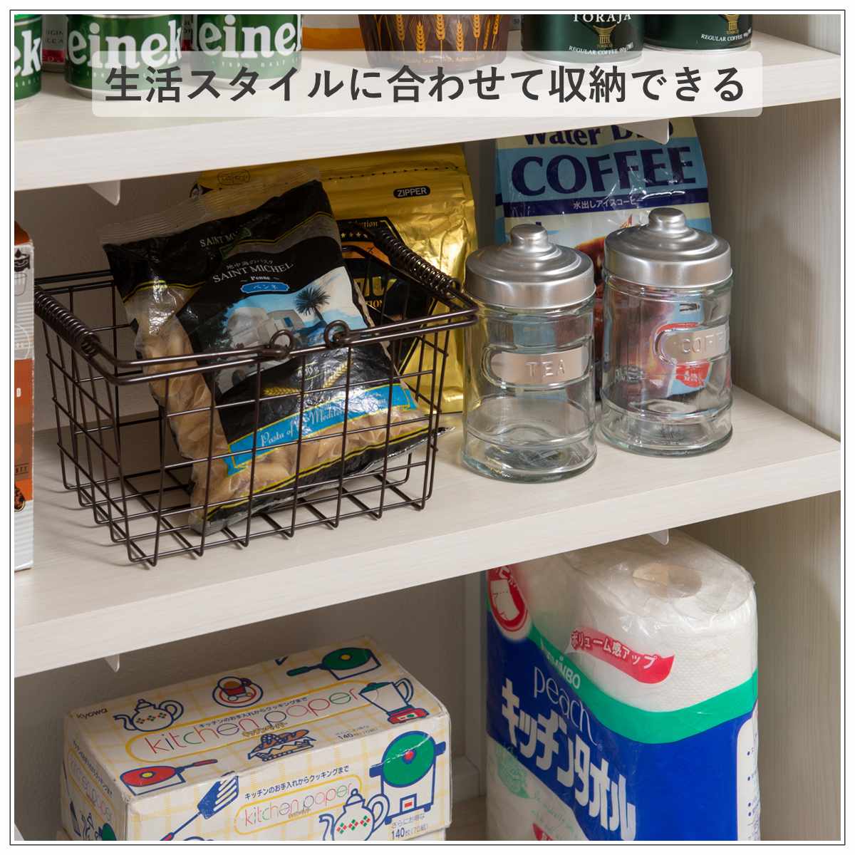 食器やコーヒー、おかしなどの頻繁に出し入れするものから、日用品のストックや本、散らかりがちな小物類などの置き場所に困るものまで、生活スタイルに合わせて自由に収納していただけます。
