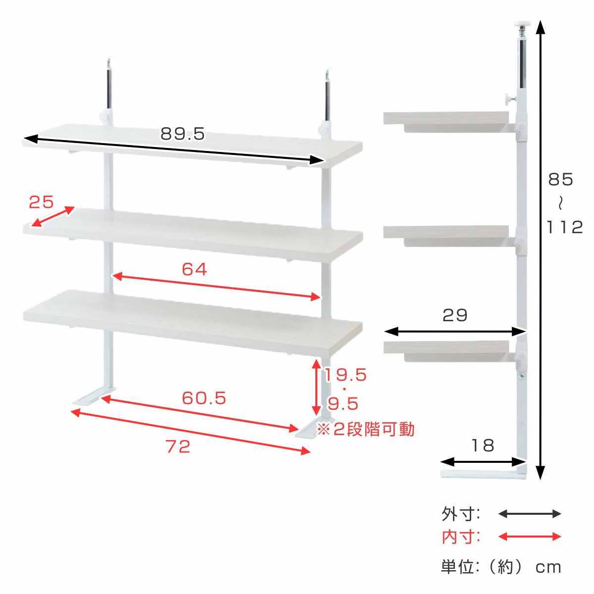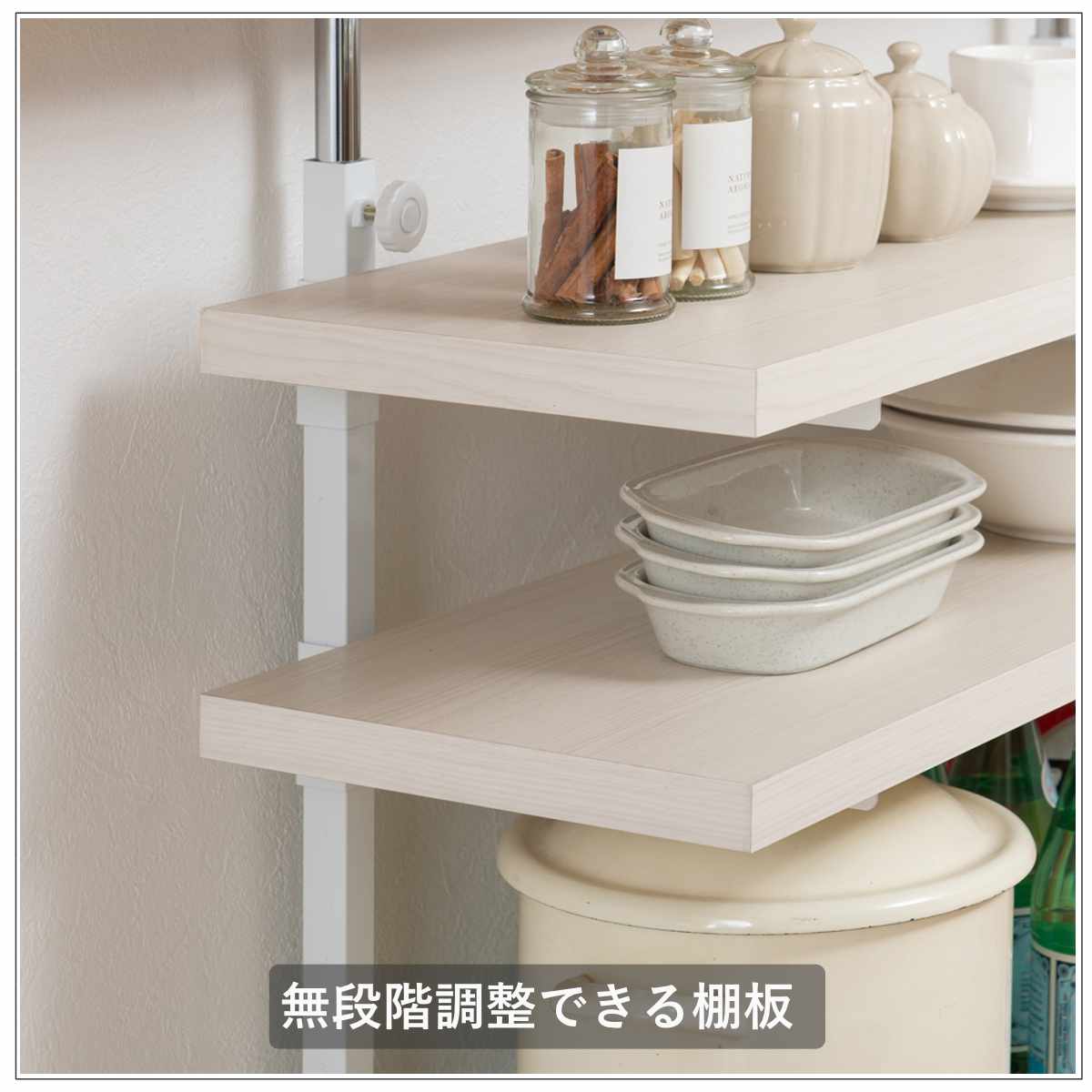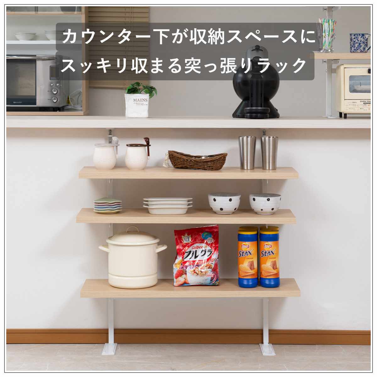 カウンター下のわずかなスペースにもスッキリ置ける、奥行29cmの突っ張りラックです。85cm~112cmまでの高さに対応しているので、今まで諦めていたカウンター下のデッドスペースを収納スペースとして有効活用していただけます。