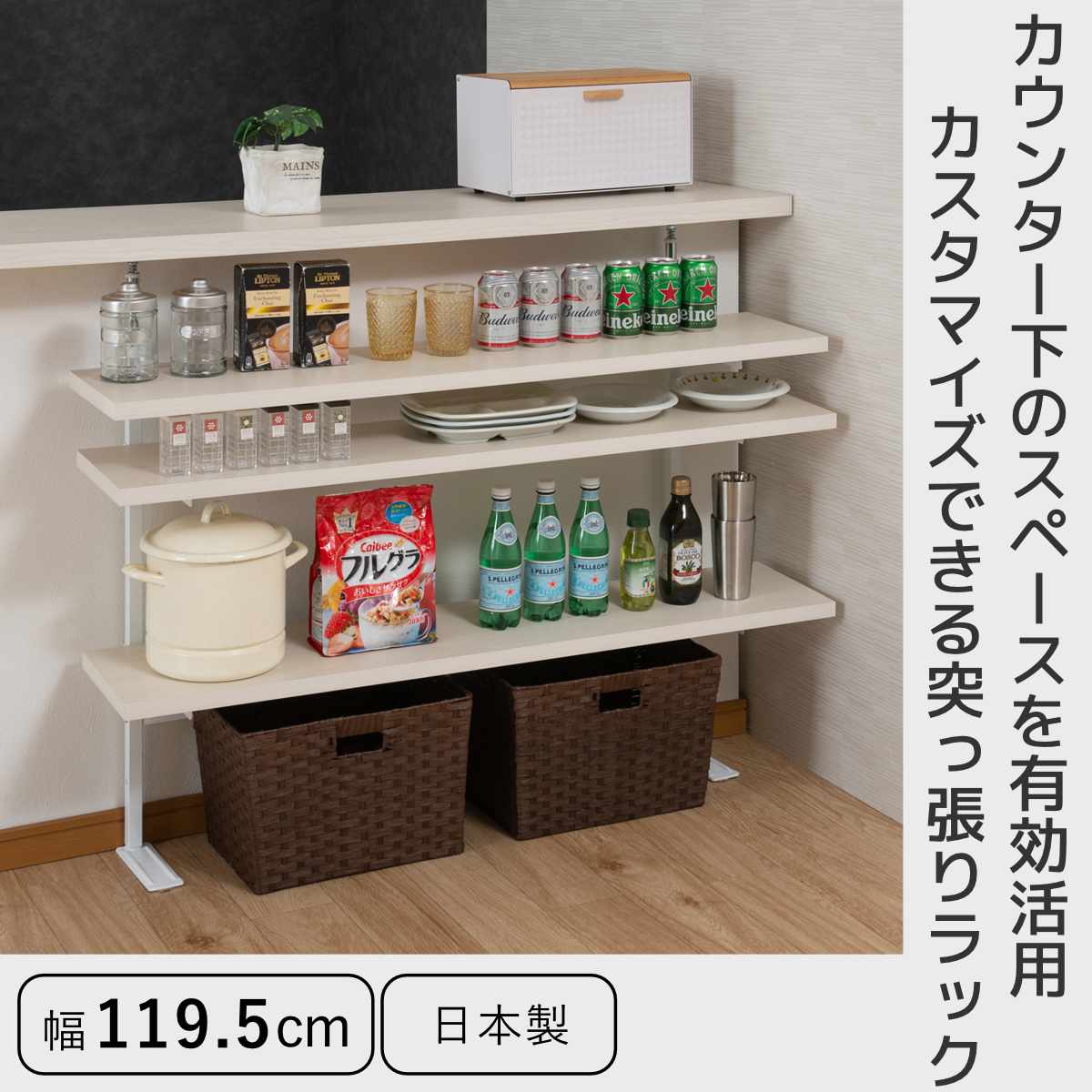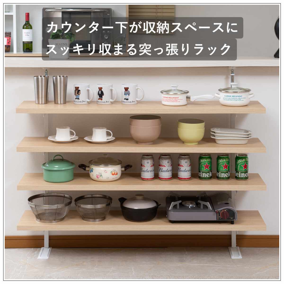 カウンター下のわずかなスペースにもスッキリ置ける、奥行29cmの突っ張りラックです。85cm~112cmまでの高さに対応しているので、今まで諦めていたカウンター下のデッドスペースを収納スペースとして有効活用していただけます。