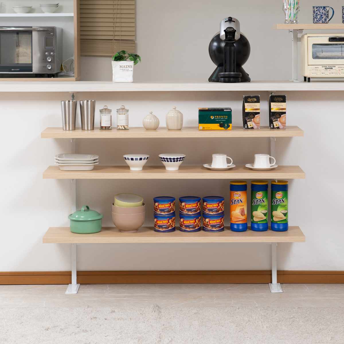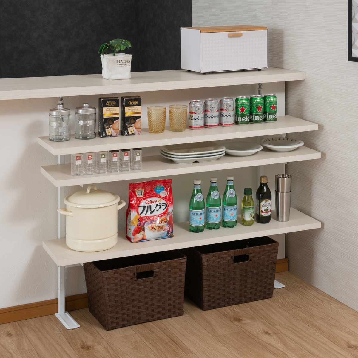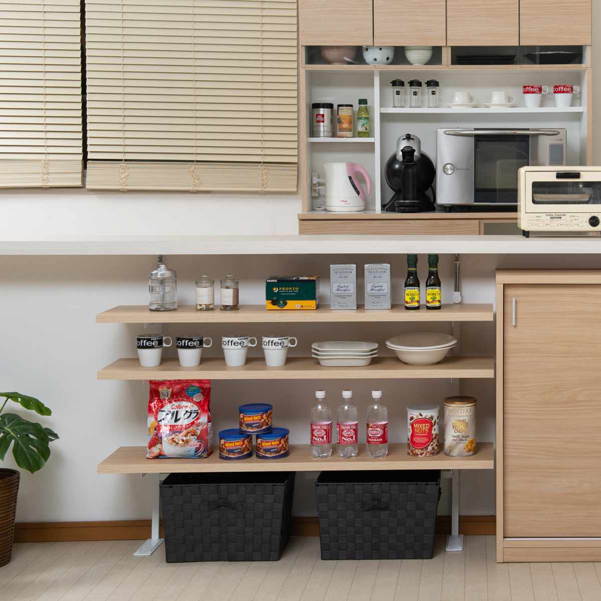 他のサイズのラックや別売りの棚板と組み合わせれば、オリジナルのカウンター下収納を作ることができます。レイアウトも自由に変更でき、カウンター下にたっぷりの収納を増やしながら、圧迫感の少ないスッキリとした空間を実現できます。