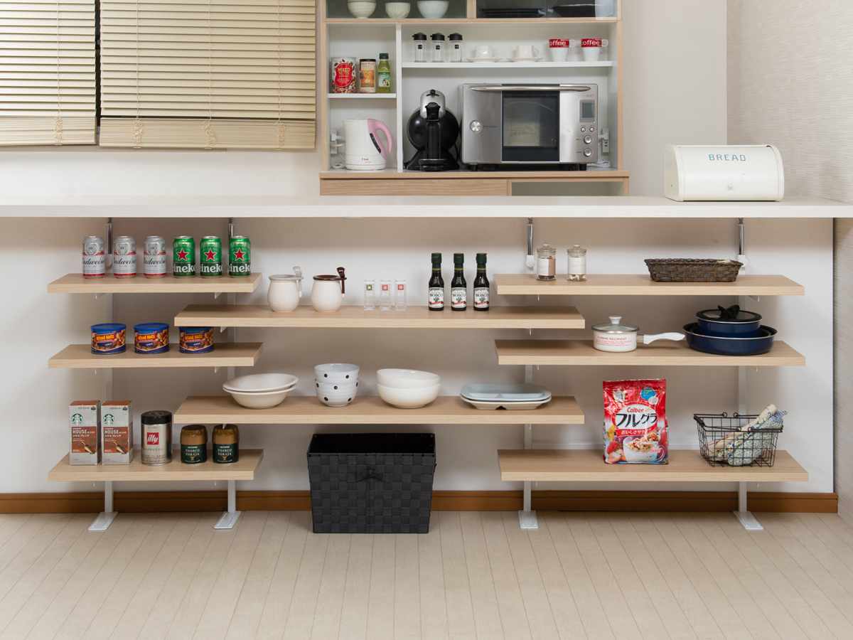 食器やコーヒー、おかしなどの頻繁に出し入れするものから、日用品のストックや本、散らかりがちな小物類などの置き場所に困るものまで、生活スタイルに合わせて自由に収納していただけます。