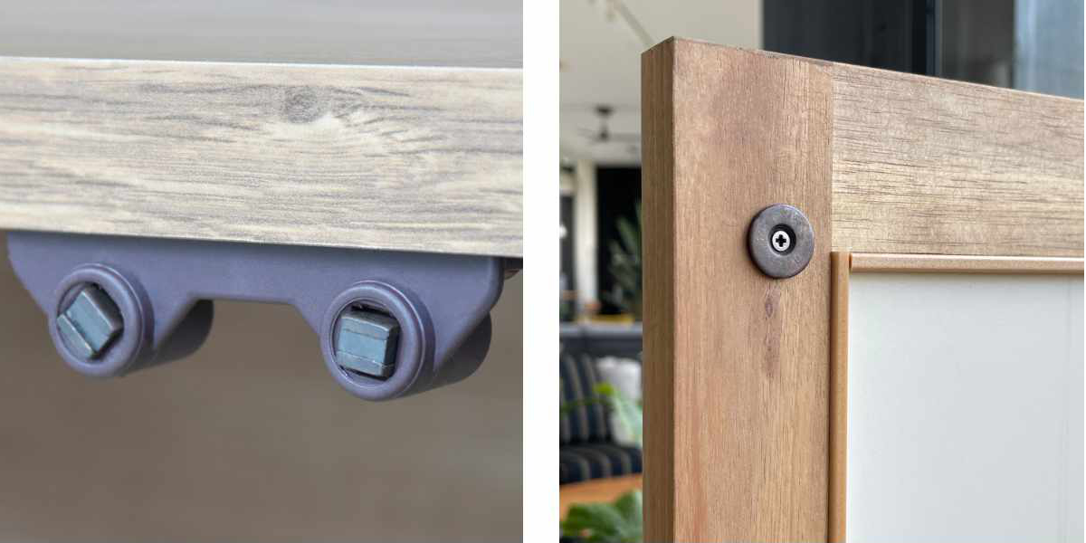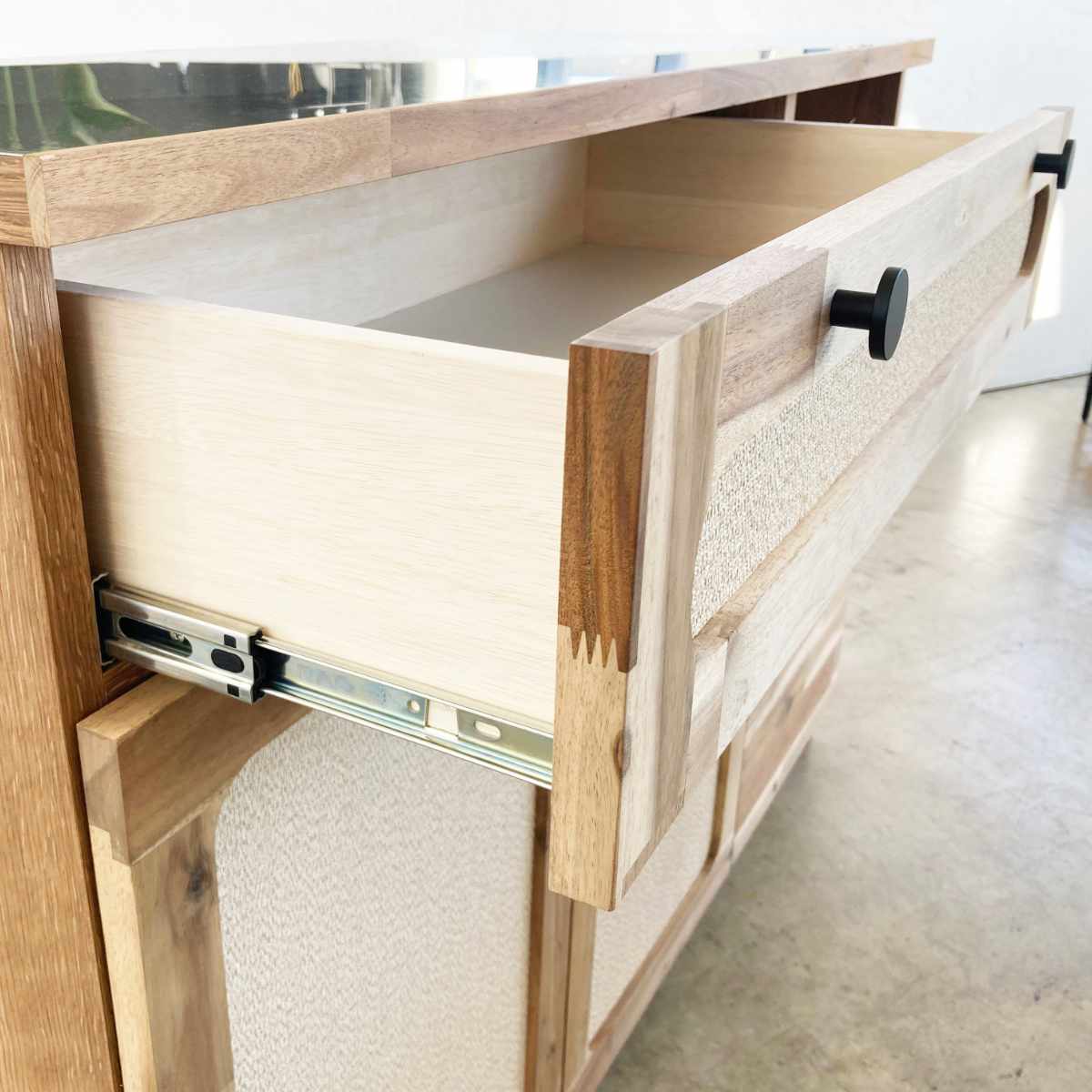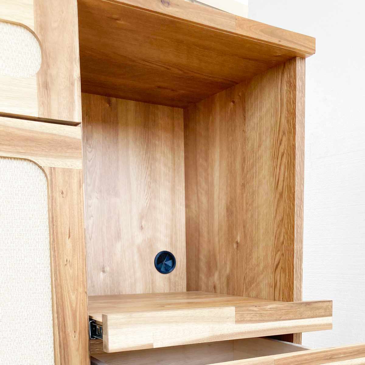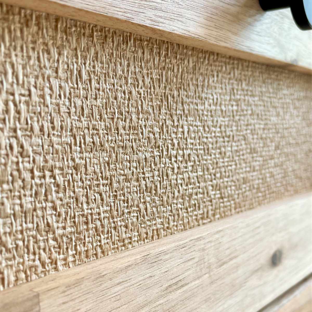 前板の縁は木目が特徴的なアカシア無垢材を使用しており、天然木のほっと安らぐあたたかみを感じることができます。前板中央には麻柄のクロスを貼っています。麻ではなくクロスを使用することで、長年ご使用いただいてもほどけてくる心配がございません。また、軽い拭き掃除も可能なのでお手入れがしやすいです。