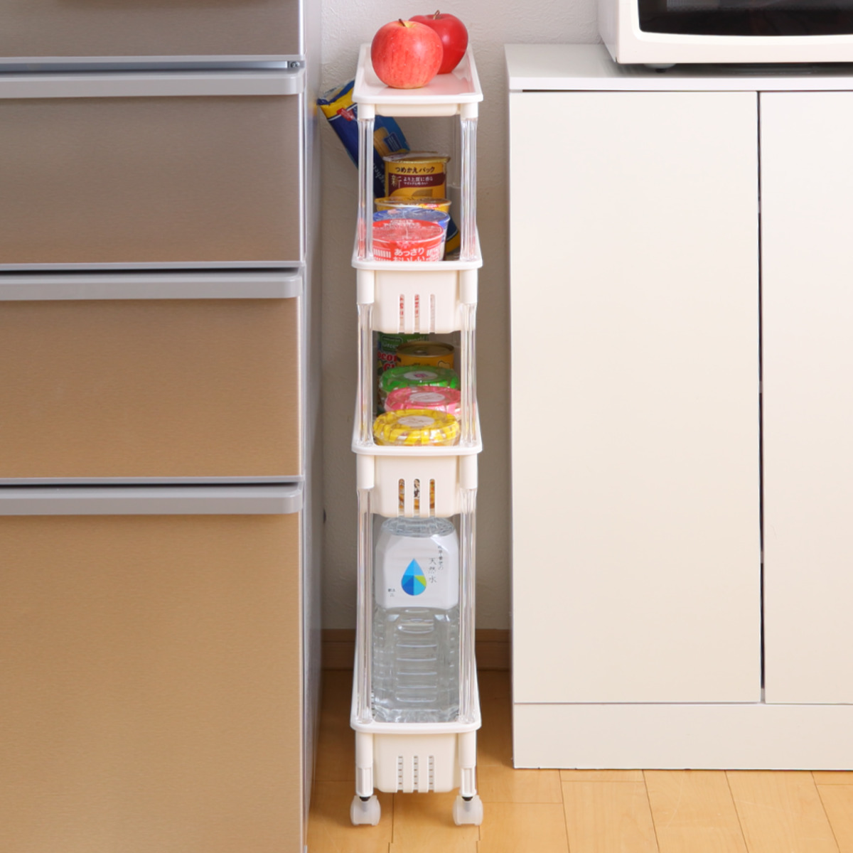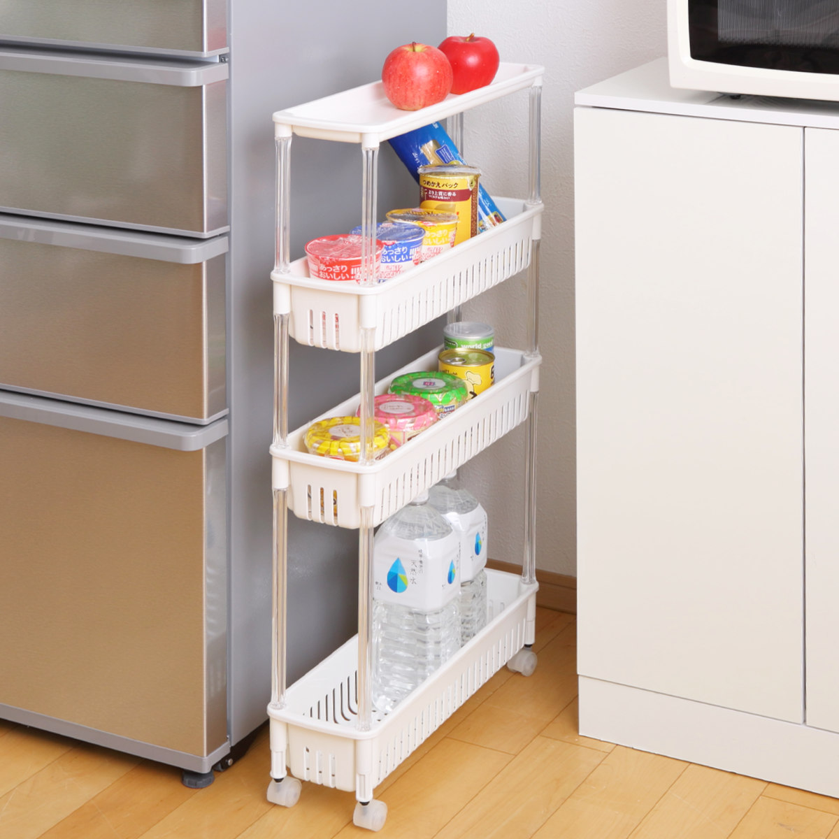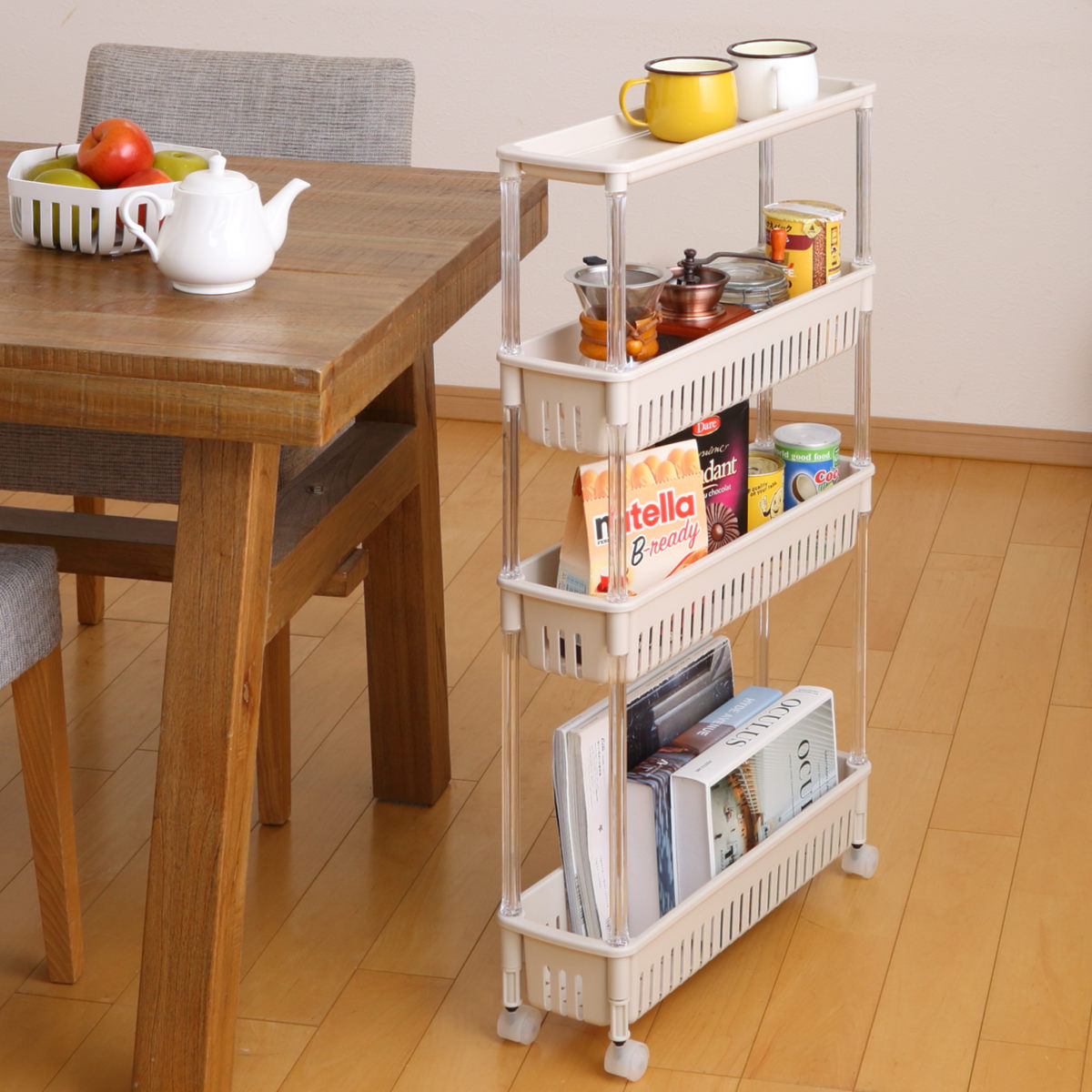 調味料や乾物のストックにちょうど良いオープンタイプのキッチンワゴンです。幅15.2cmとスリム設計なので、ちょっとしたすき間を収納として有効活用できます。