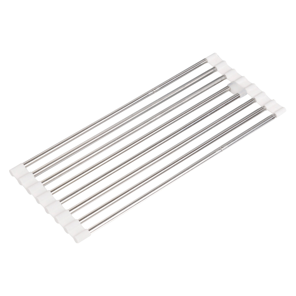 約36~56cmのシンクに渡して使えるスライド式パイプ棚です。洗い物の水切りや調理直後の熱いお鍋の一時置きにも使えます。枠部は滑りにくく、シンクを傷つけないシリコーン製です。