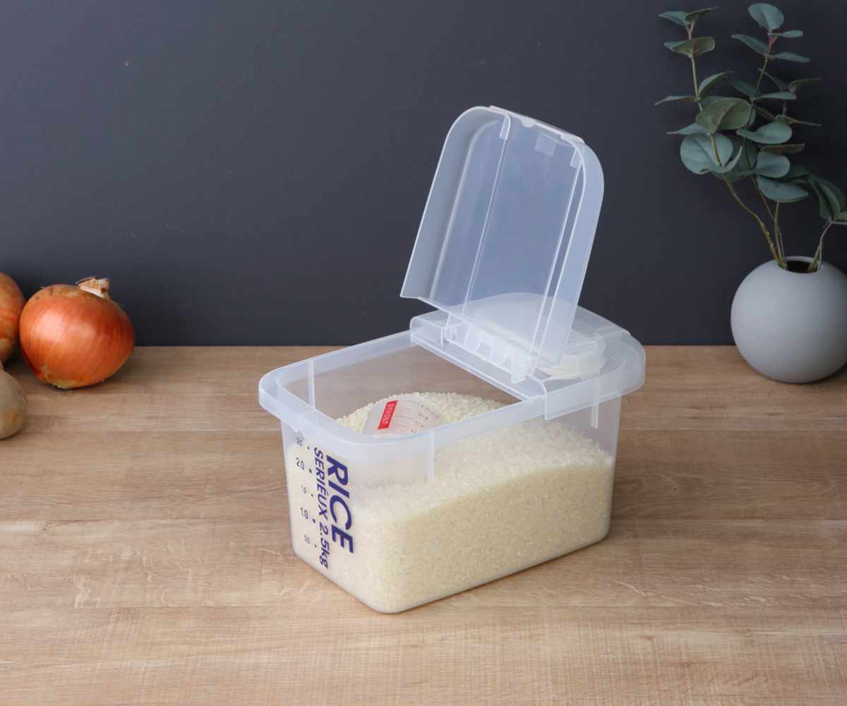大きく開くフタは、開けたまま固定されます。お米の出し入れがしやすく、計量もスムーズです。