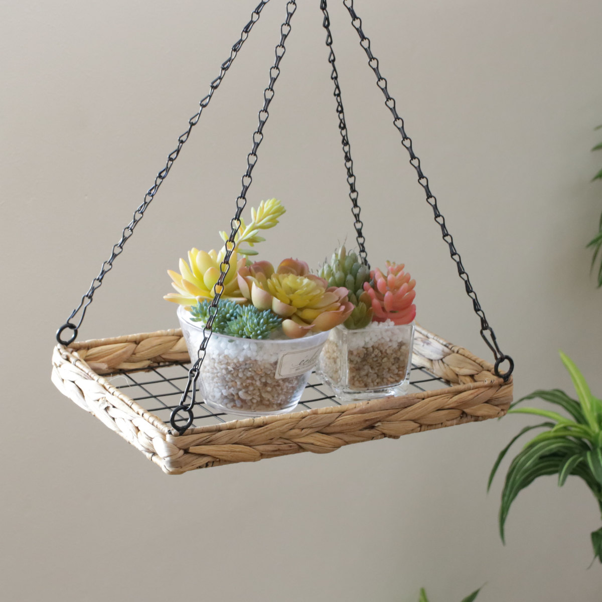天然素材を使用した手編み感のあるハンギングシェルフです。天井から吊るす手軽なインテリアとしてお楽しみいただけます。フェイクグリーン、イミテーションフラワーなど入れてアレンジしたり、エアプランツなどの植物を置いて飾るのもおすすめです。