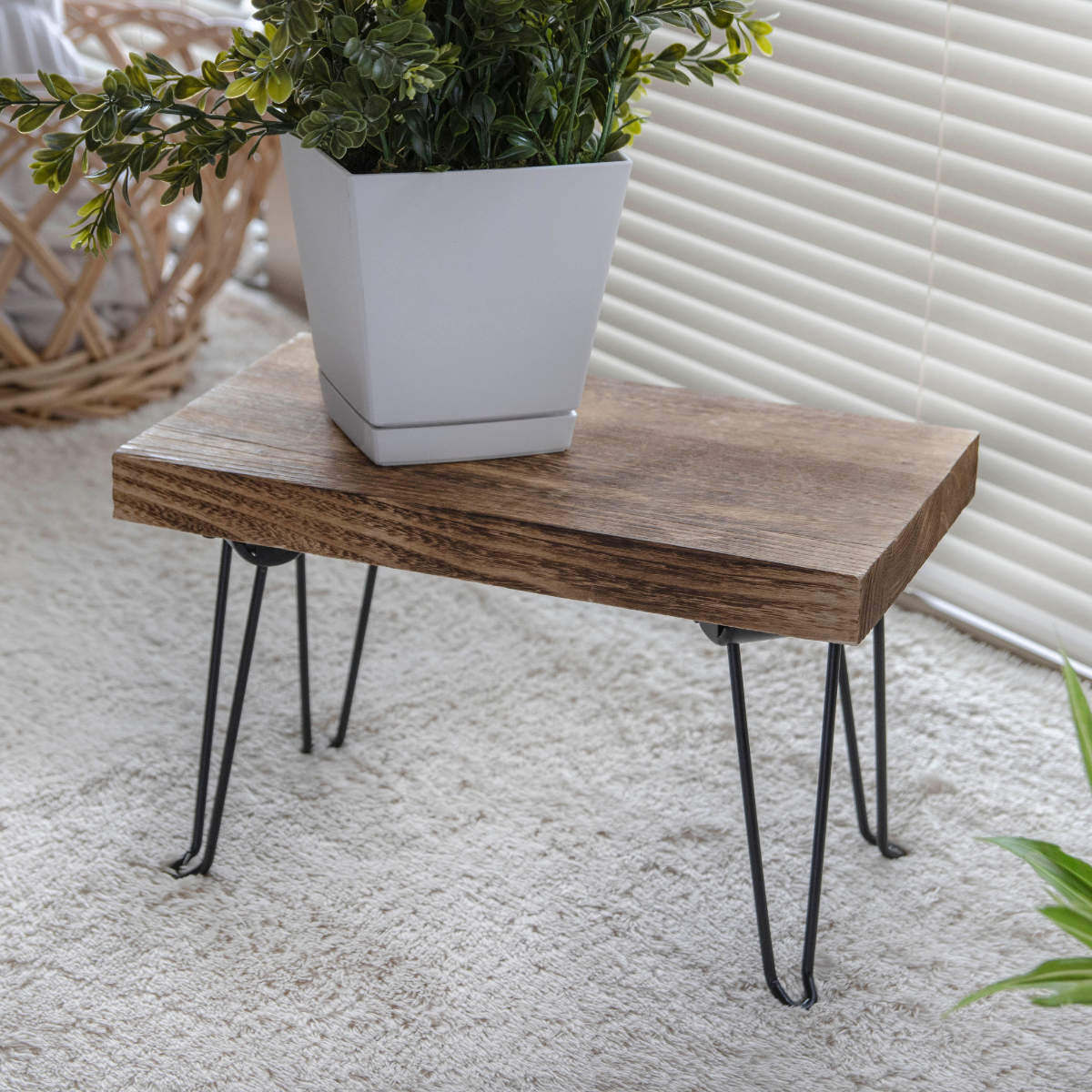 モダンテイストなアイアンレッグをプラスした木製スタンド、ピエニシリーズです。ラウンド・スクエア・レクトの3種類の形、ナチュラル・ホワイト・グレーの3色からお部屋の雰囲気に合わせてお選びいただけます。形違いや色違いをシリーズで揃えると統一感のある空間になります。