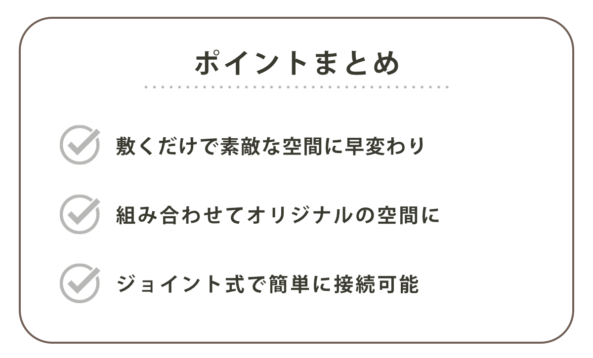 工具も接着剤も不要で、誰でも簡単に敷き詰められる構造です。